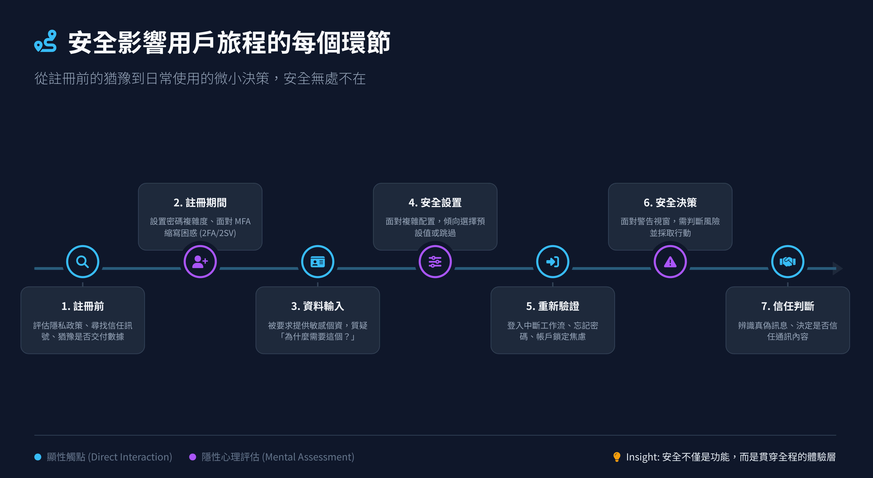 投影片接下來會按照用戶旅程的順序,帶你看七個關鍵安全觸點:從註冊前的猶豫,一路到決定信任誰、信任什麼。