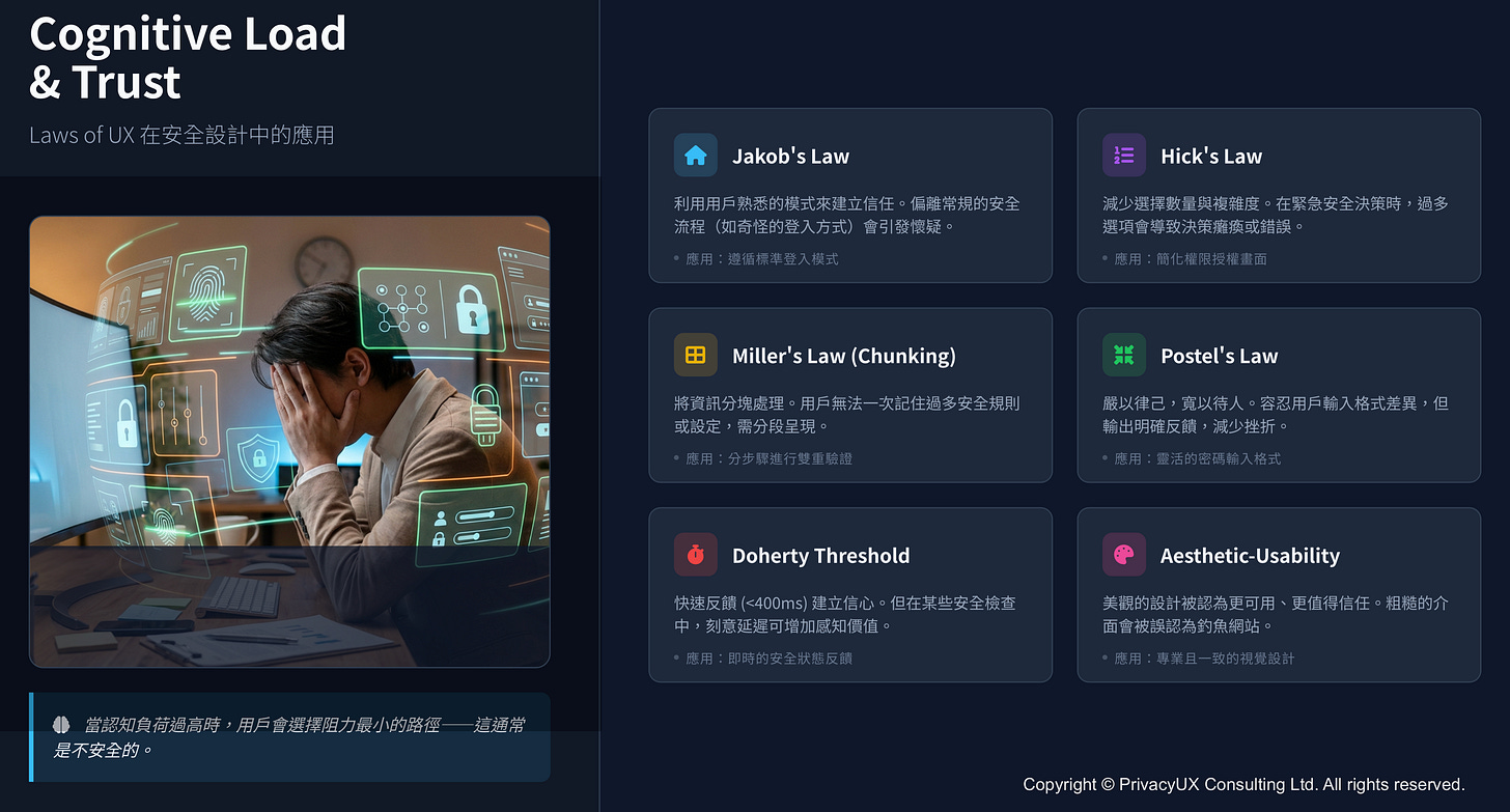這個目標本身就是設計問題:需要借助 UX 心理學、設計規律與心智模型的理解,才能在不犧牲保護力的前提下,減少不必要的恐懼、羞愧與挫折。