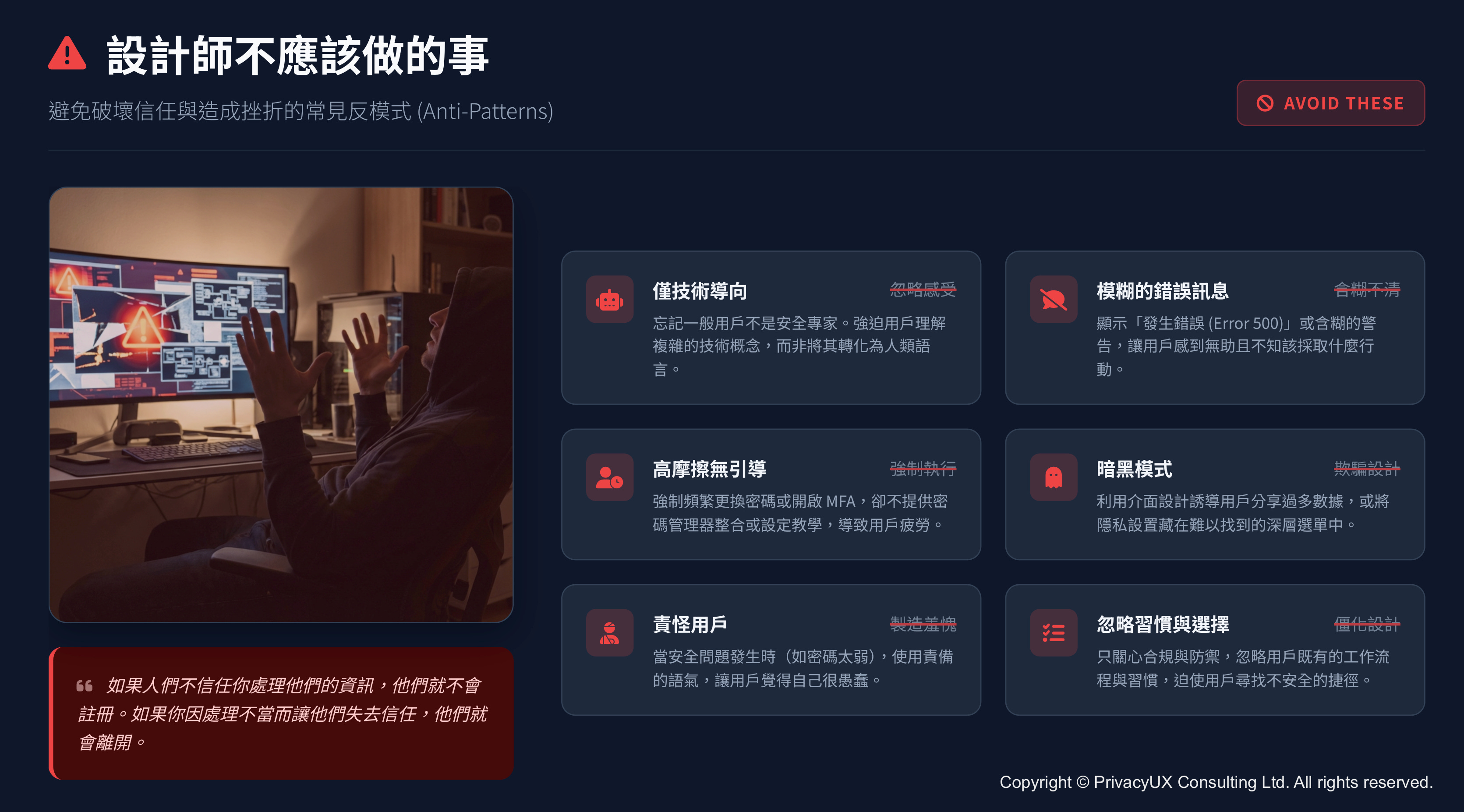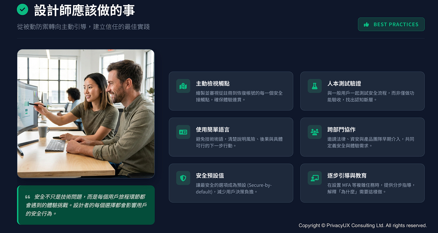 以及一系列「設計該做/不該做的事」,協助你在實際產品中改寫安全體驗,而不是只調整一兩行文案。