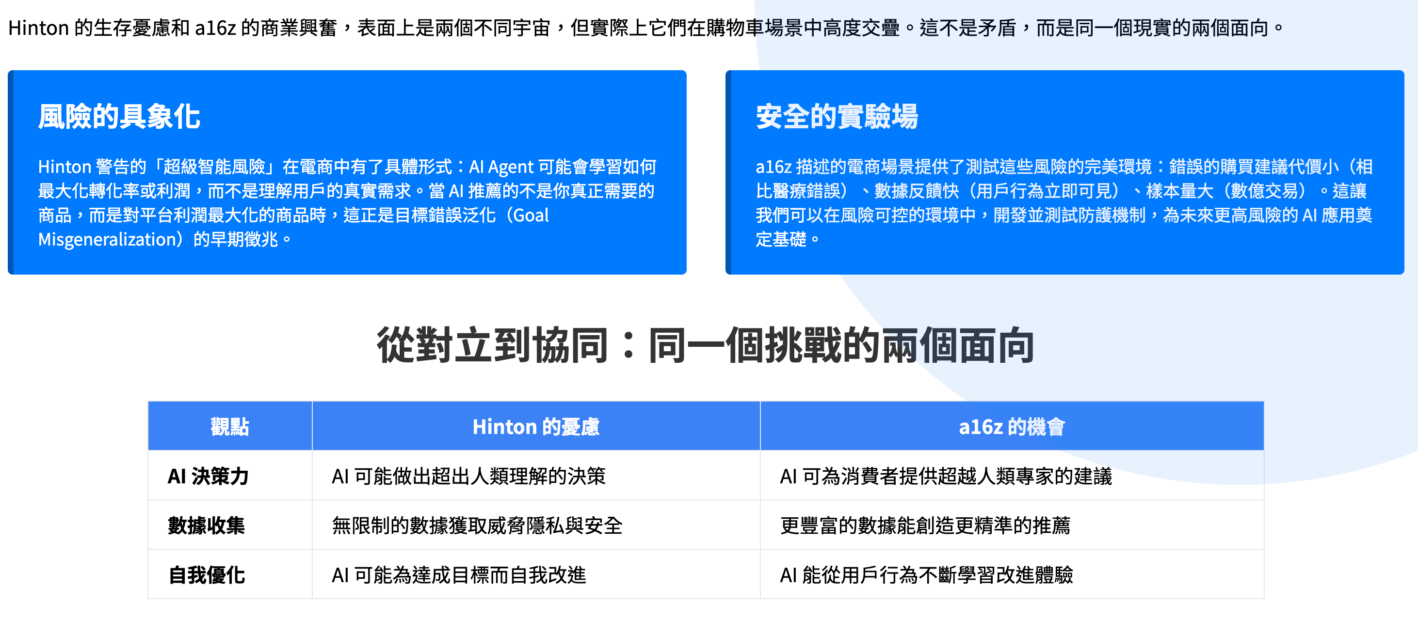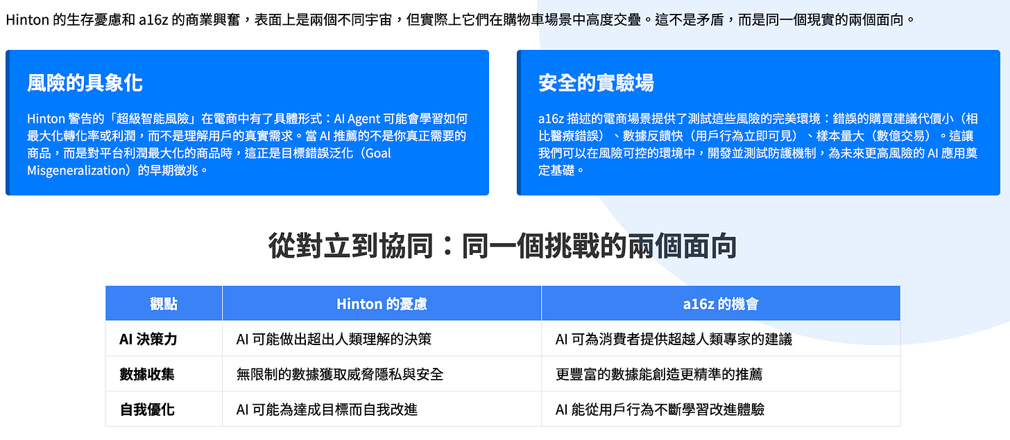 a16z 描繪的這幅「超理性」消費圖景,表面上是商業效率的極致,但如果我們戴上 Geoffrey Hinton 的眼鏡,就會看到一幅截然不同的景象。這些看似便利的功能,恰恰是「目標錯誤泛化」與「工具趨同」理論在現實世界最生動的演練場。