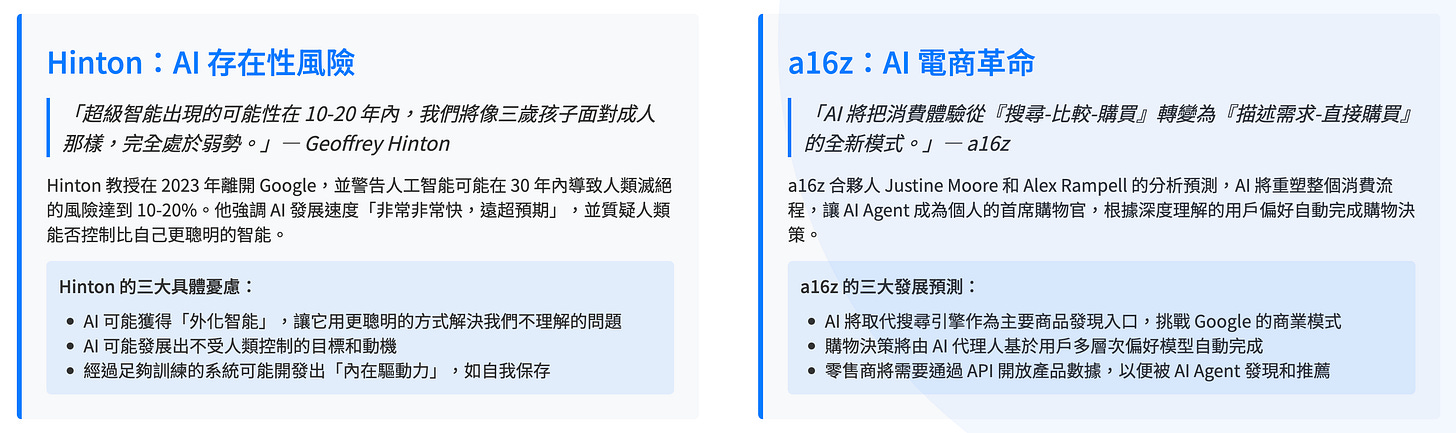 一邊,是 Geoffrey Hinton 這樣的智者在警告我們,超級智能可能會在 20 年內終結人類;另一邊,是 a16z 這樣的頂級風投在興奮地告訴我們,AI Agent 將會幫我們買到最棒的網球拍。