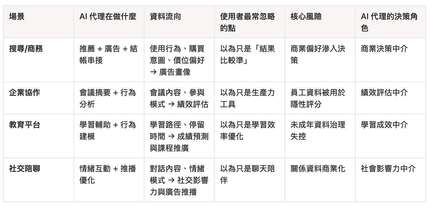 這篇要往前推一步:當 AI 不只是被廣告影響,而是直接成為「代理決策者」時,風險從「被操弄」升級為「被代理」。 問題不再只是「廣告藏在哪裡」,而是「你的決策流程已經被 AI 全權接管,你知道嗎?」