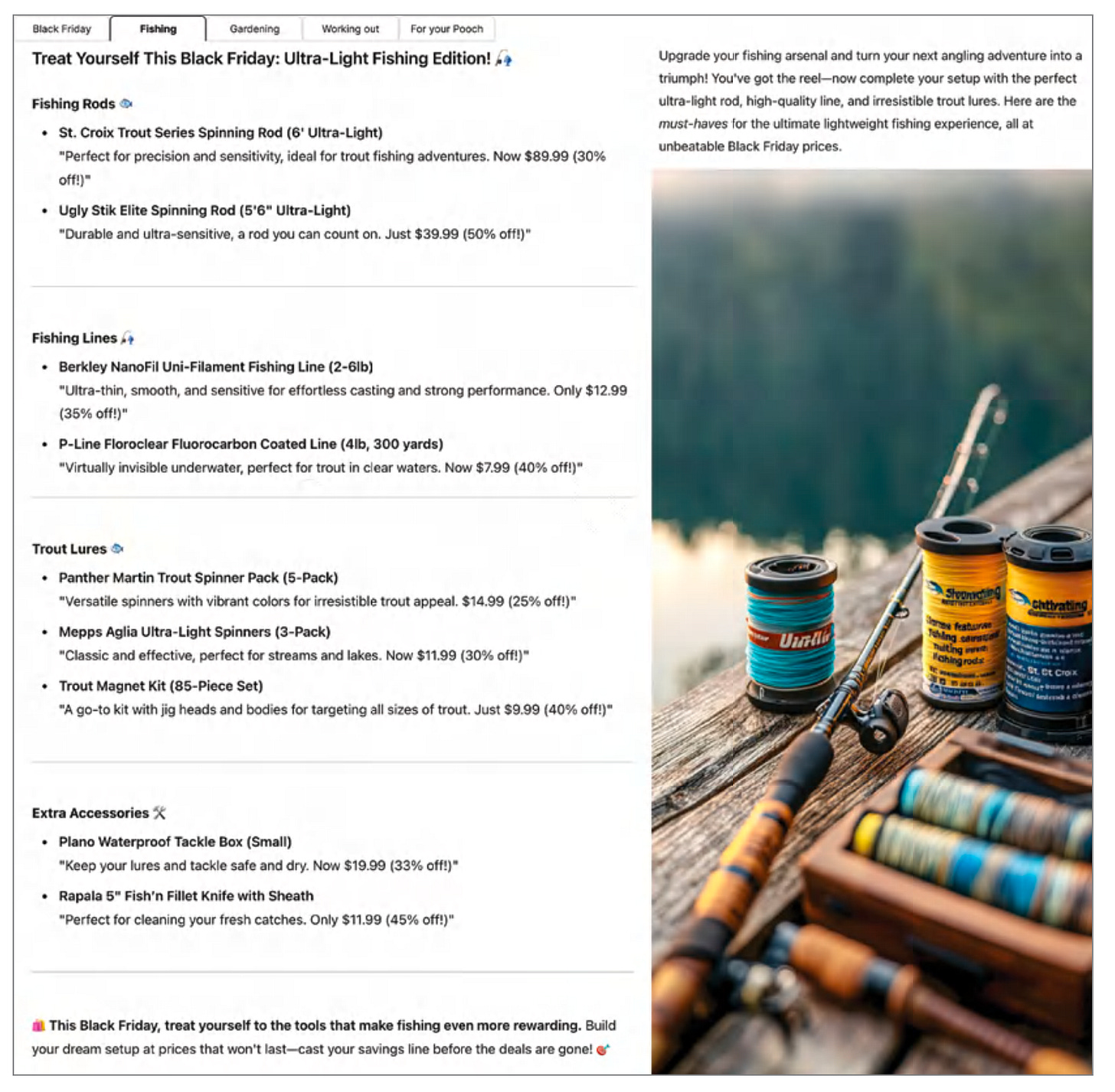 這對於釣魚愛好者來說,相當於視覺上的古柯鹼。而我只花了幾分鐘就「設計」(更像是「組合」或「編排」)了這個基於 ChatGPT 輸出的頁面。現在想像一下,你的用戶真正關心的每一個類別,都經過精心分析,可能打折的商品被突顯出來,還有一個特別為你的興趣和購物習慣挑選的客製化商品盛宴。這種個人化程度完全把目前的體驗,呃,甩在了身後。