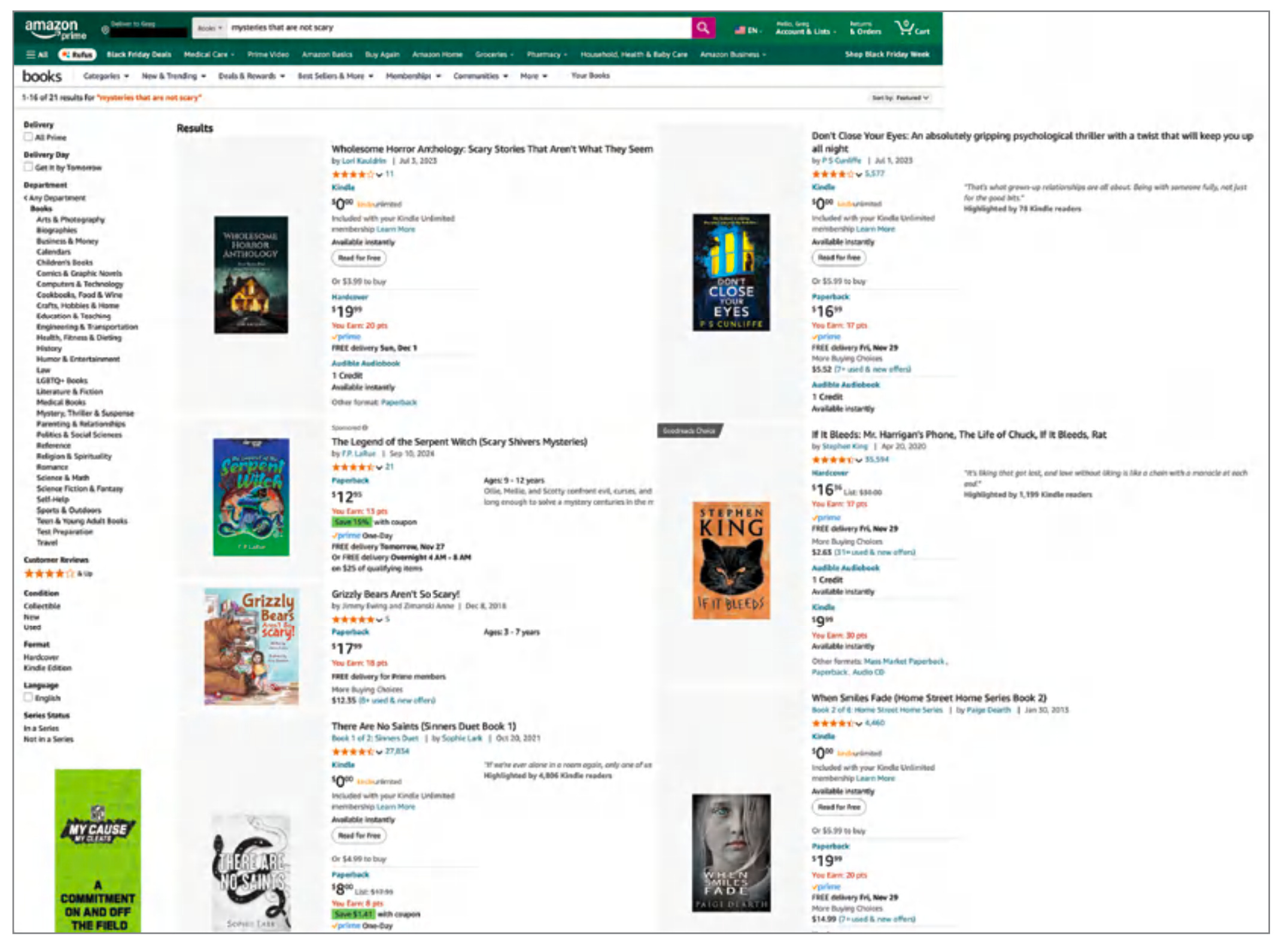 就像我們在第十章回顧這個查詢時一樣,書籍產品類別的結果也包括了各種各樣的命中。從童書到史蒂芬·金非常恐怖的《如果它流血》,再到大概很嚇人的《不要閉上你的眼睛》,後者承諾是「一本絕對扣人心弦的心理驚悚小說,其轉折會讓你徹夜難眠」。