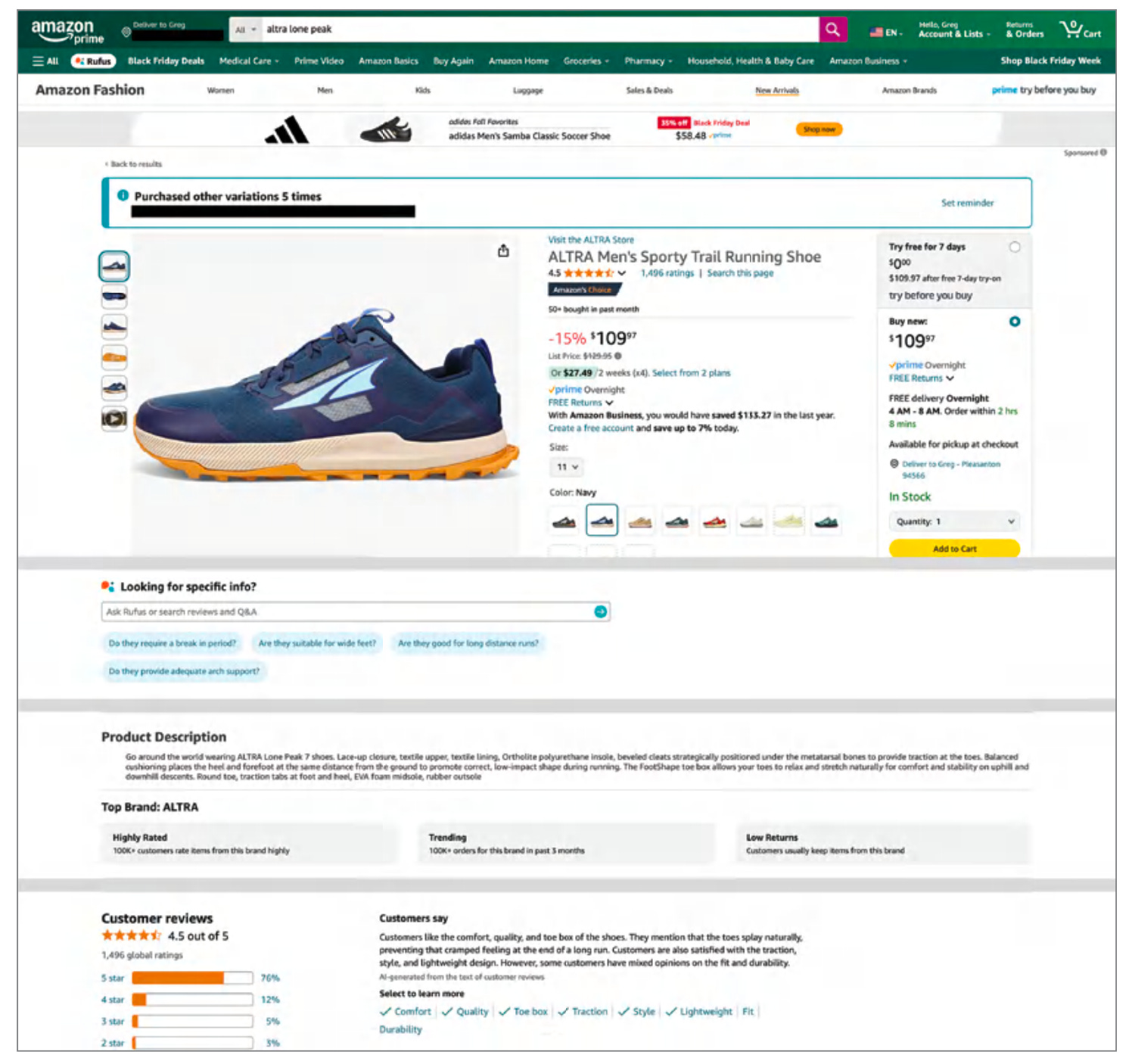 與搜尋結果相反,商品詳情畫面是 Amazon.com 的 LLM 功能真正發揮作用的地方,如下圖所示。