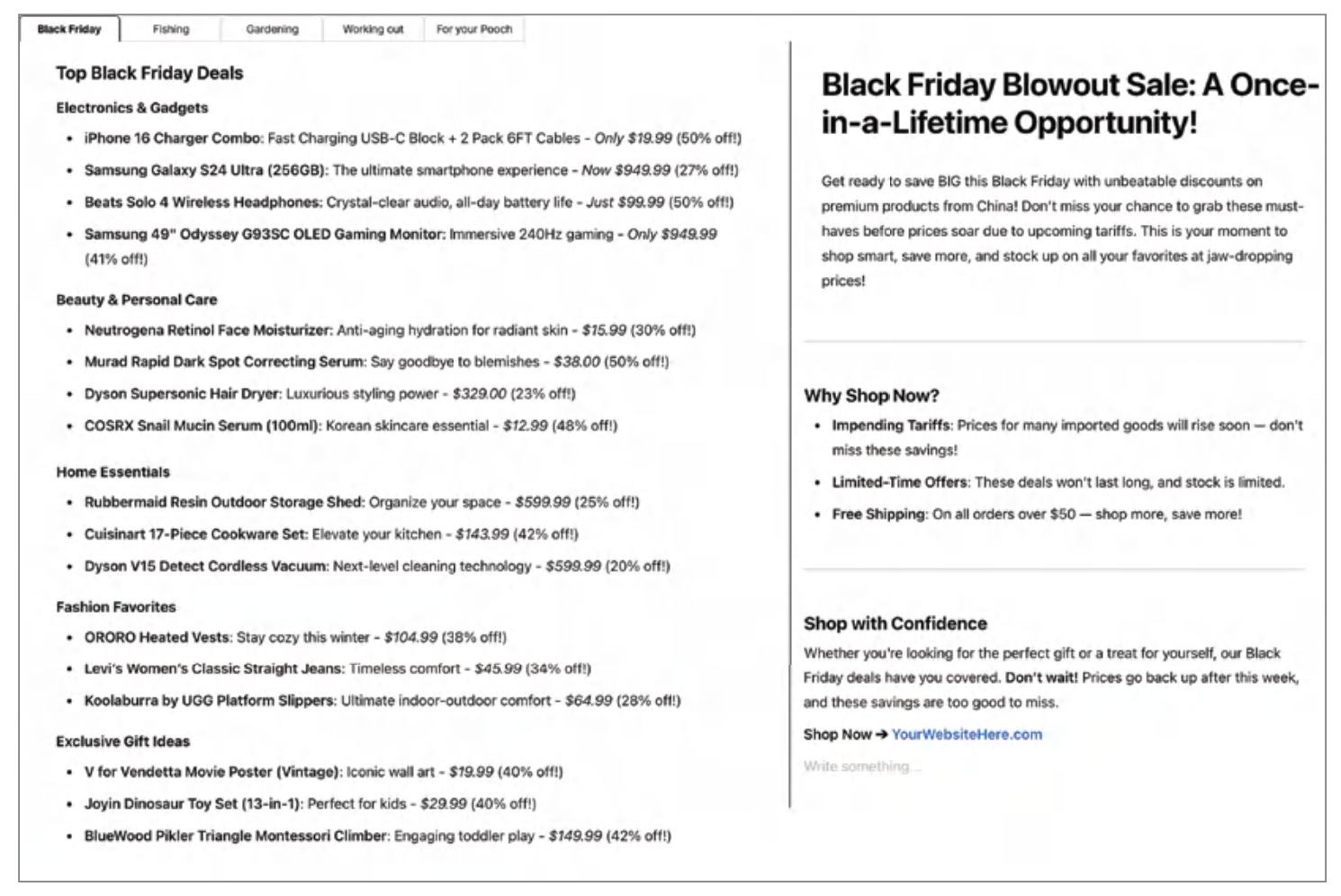 我絕無意干涉這樣一個神聖的美國年度傳統!事實上,我建議使用 LLM 來加倍推動這場慣常的狂熱。下圖展示了一個由 ChatGPT 4o 製作的快速線框圖。只要想像一些商品圖片細節(也許還有一張人群為最後一個 Tickle Me Elmo 玩具殊死搏鬥的動態鏡頭),你就身臨其境了。