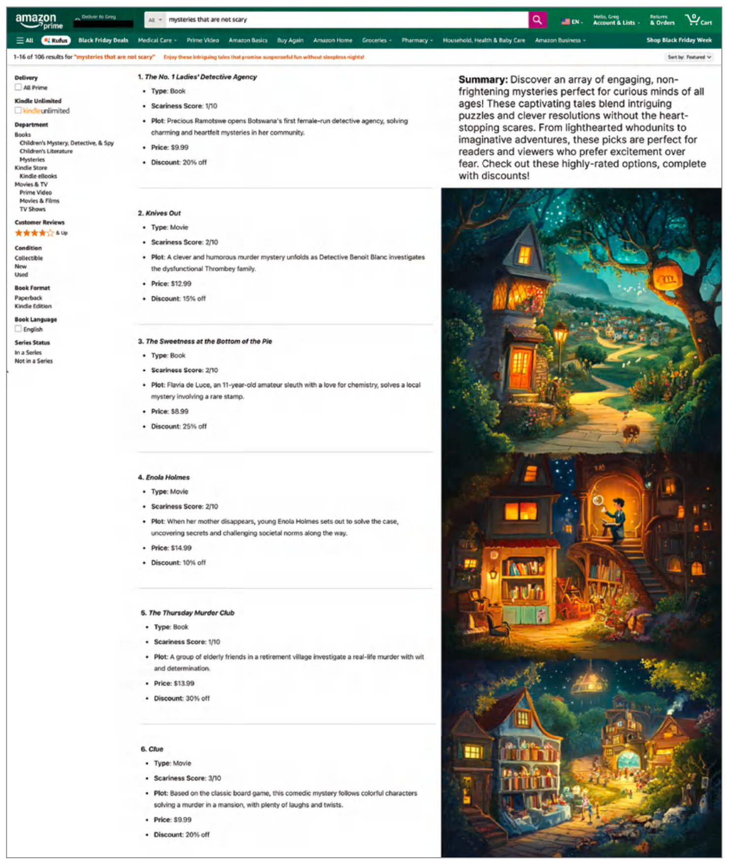 機器的查詢解讀:「享受這些引人入勝的故事,保證懸疑有趣而不會讓你徹夜難眠!」(在頁面頂部)。它既俏皮又精準。它用自然語言捕捉了你所要求的精神。今天沒有任何電子商務網站這樣做(還沒有)。回想一下,我們在第九章「LLM 設計模式」中介紹了「重述」和其他基於文字的 Copilot 設計模式。