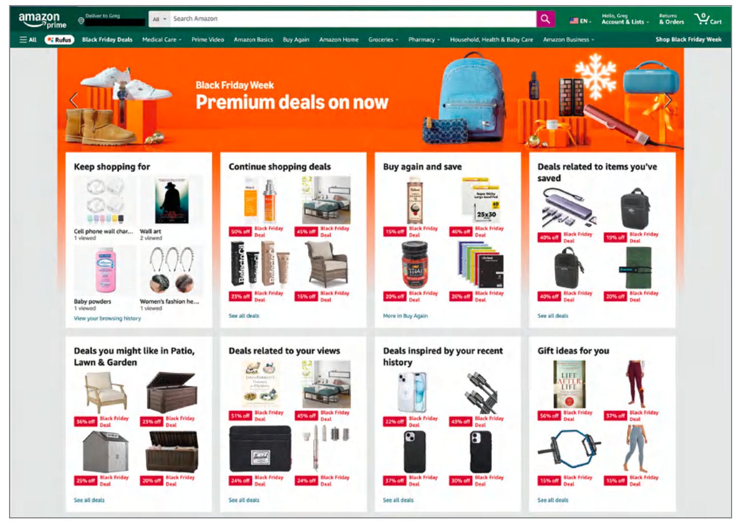 正如你無疑知道的,Amazon.com 在很大程度上已經是一個 AI 優先的應用程式,其首頁很容易地反映了這一點,根據演算法認為用戶可能喜歡的東西來誘惑他們進行促銷(見下圖)。