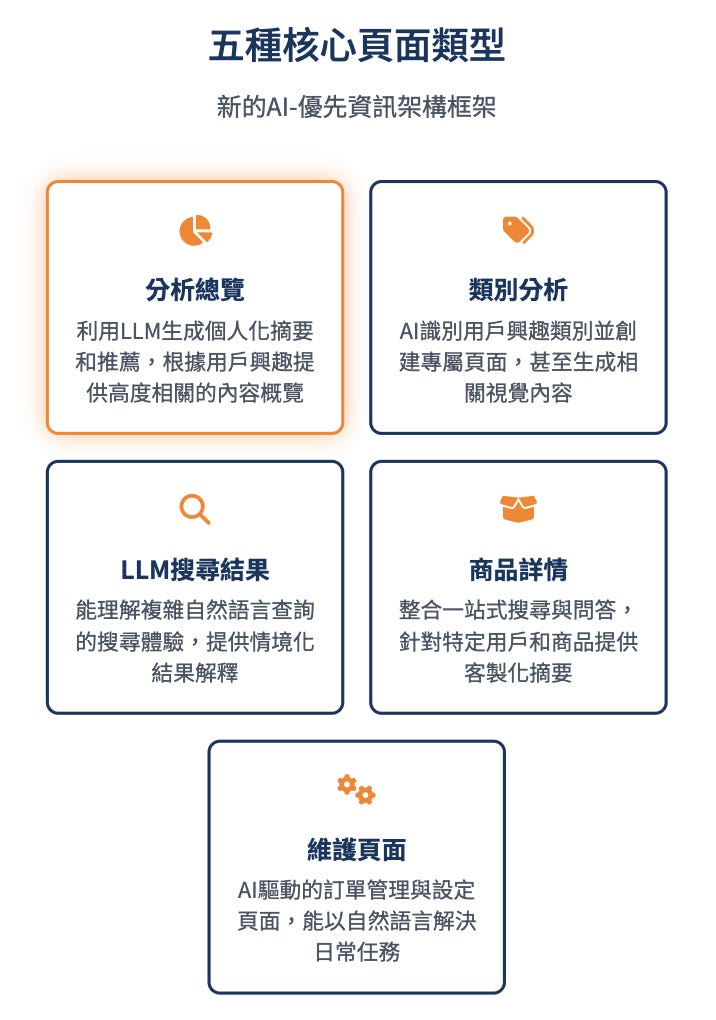 重要的是,沒有必要徹底改變舊 IA 的重點,但我們當然可以更好地適應現代 AI 的能力。一個極好的起點是以下五種類型的頁面:分析總覽、類別分析、LLM 搜尋結果、商品詳情和維護。這些構成了 AI-優先資訊架構框架的核心。到目前為止,新舊 IA 之間沒有太大區別,但正如他們所說,魔鬼藏在細節中。