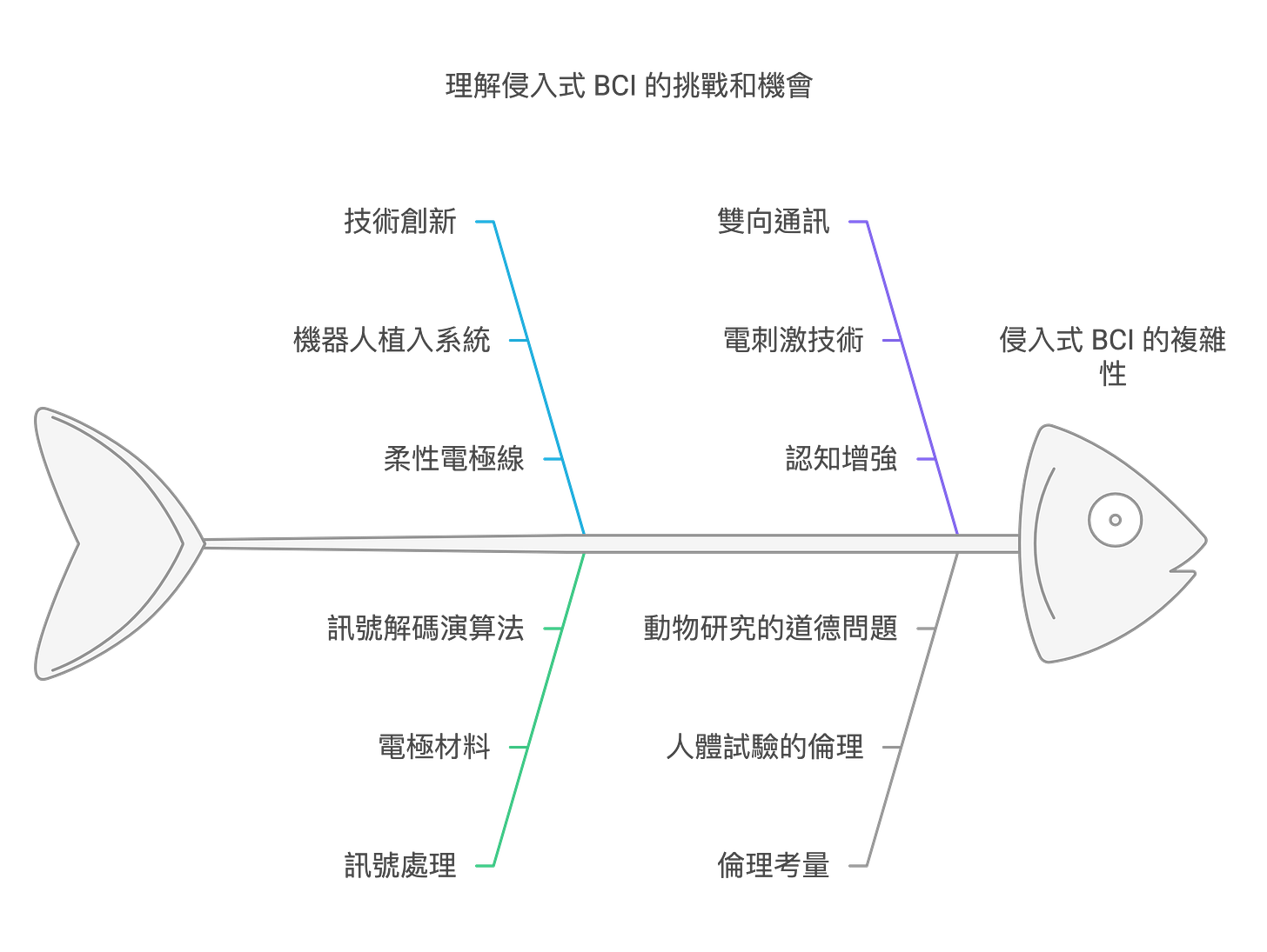 未來願景:人機深度融合是侵入式 BCI 最具科幻色彩,也最具爭議性的未來願景。它指的是將人腦與機器智能深度整合,創造出超越人類自身能力的混合智能體。人機深度融合可能有多種形式,例如,通過 BCI 將人工智能算法植入人腦,增強人類的認知能力、記憶力、學習能力;通過 BCI 將多個大腦連接起來,實現集體智慧和意識共享;甚至通過 BCI 將人類意識上傳到雲端,實現永生。人機深度融合引發了深刻的哲學和倫理問題,例如,人類的定義是否會被重新界定?人機融合體是否還能被視為人類?這種技術的發展將對社會、文化、倫理帶來怎樣的衝擊?這些問題需要我們在技術發展的同時進行深入的思考和探討。