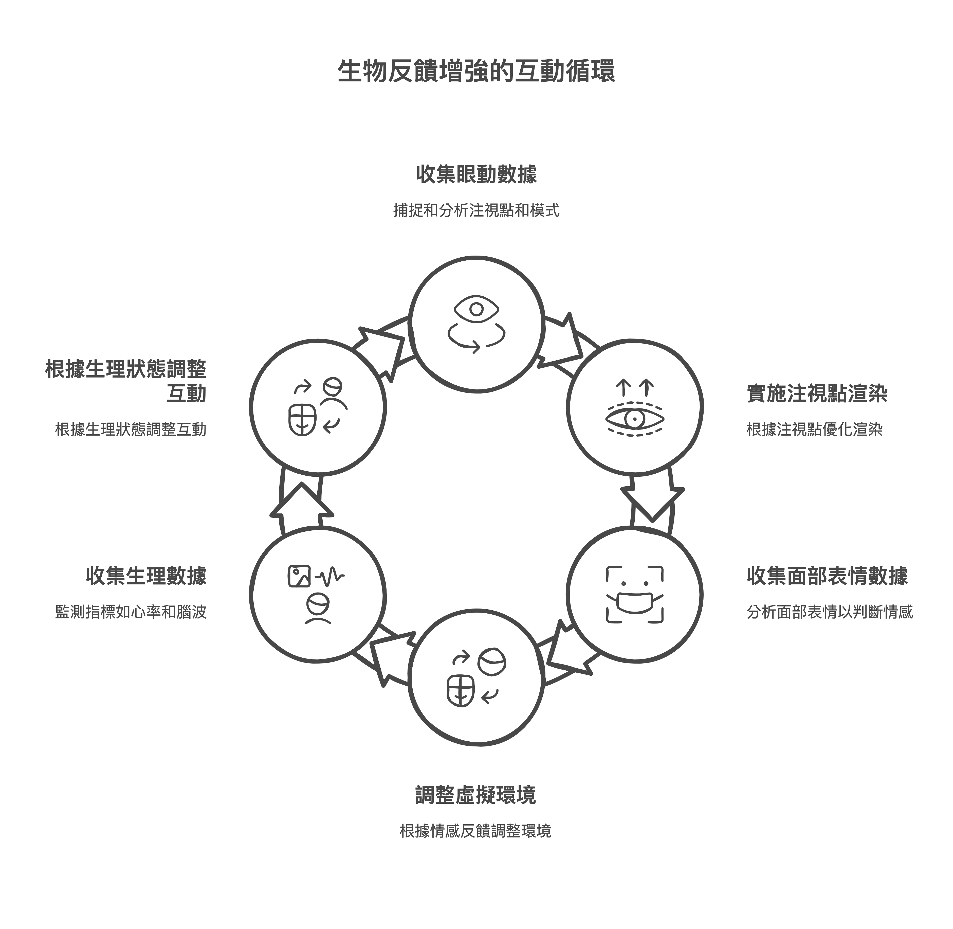 眼動追蹤:眼動追蹤技術可以實時捕捉使用者的眼球運動軌跡,並分析使用者的注視點和眼動模式。這項技術可以應用於多個方面,例如實現注視點渲染(Foveated Rendering),即只對使用者注視的區域進行高精度渲染,從而降低系統的計算負擔;實現基於注視點的互動,例如通過注視選中介面元素或觸發操作;以及分析使用者的注意力分佈和興趣點,為個性化推薦和使用者行為分析提供數據支持。