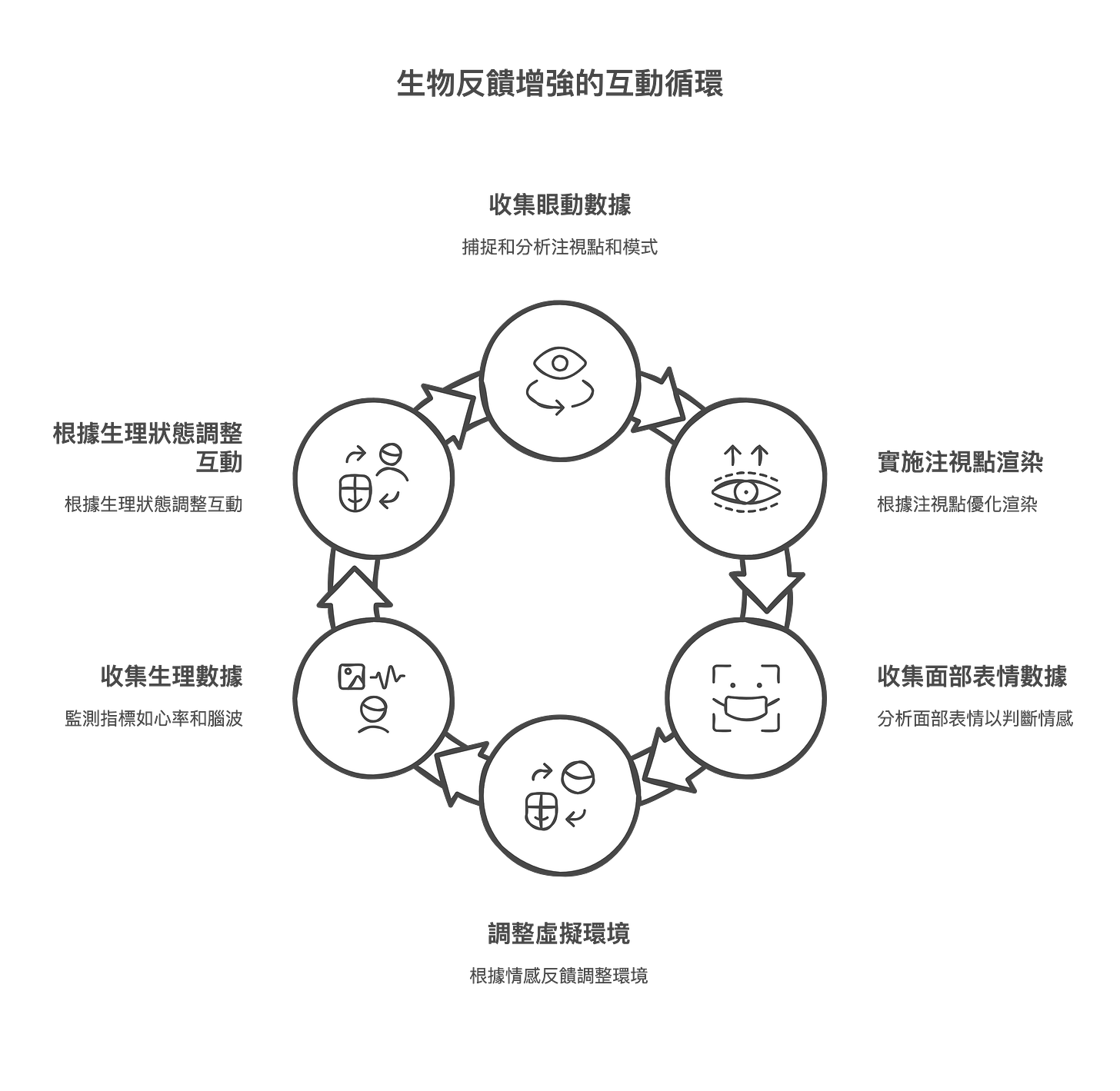 生理訊號感知:除了眼動和表情,其他生理訊號,例如心率、皮膚電導、腦電波等,也可以被感知和分析,用於更深入地了解使用者的生理和心理狀態。生理訊號感知技術可以應用於生物反饋、壓力監測、使用者狀態評估、以及基於生理狀態的自適應互動等方面。例如,系統可以根據使用者的心率變化,判斷其是否處於緊張或放鬆狀態,並自動調整虛擬環境的難度或節奏,提供更舒適、更有效的互動體驗。
