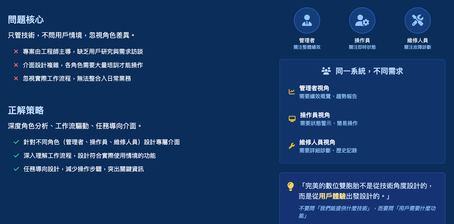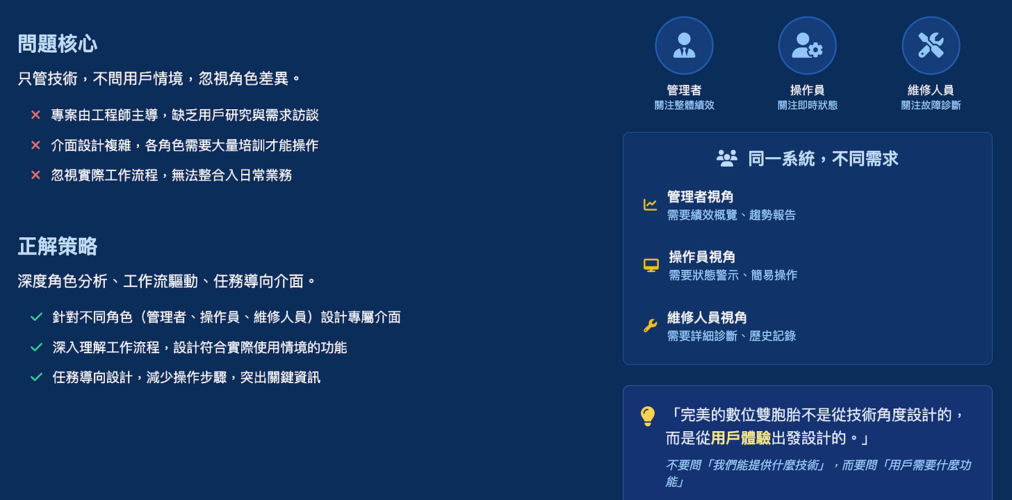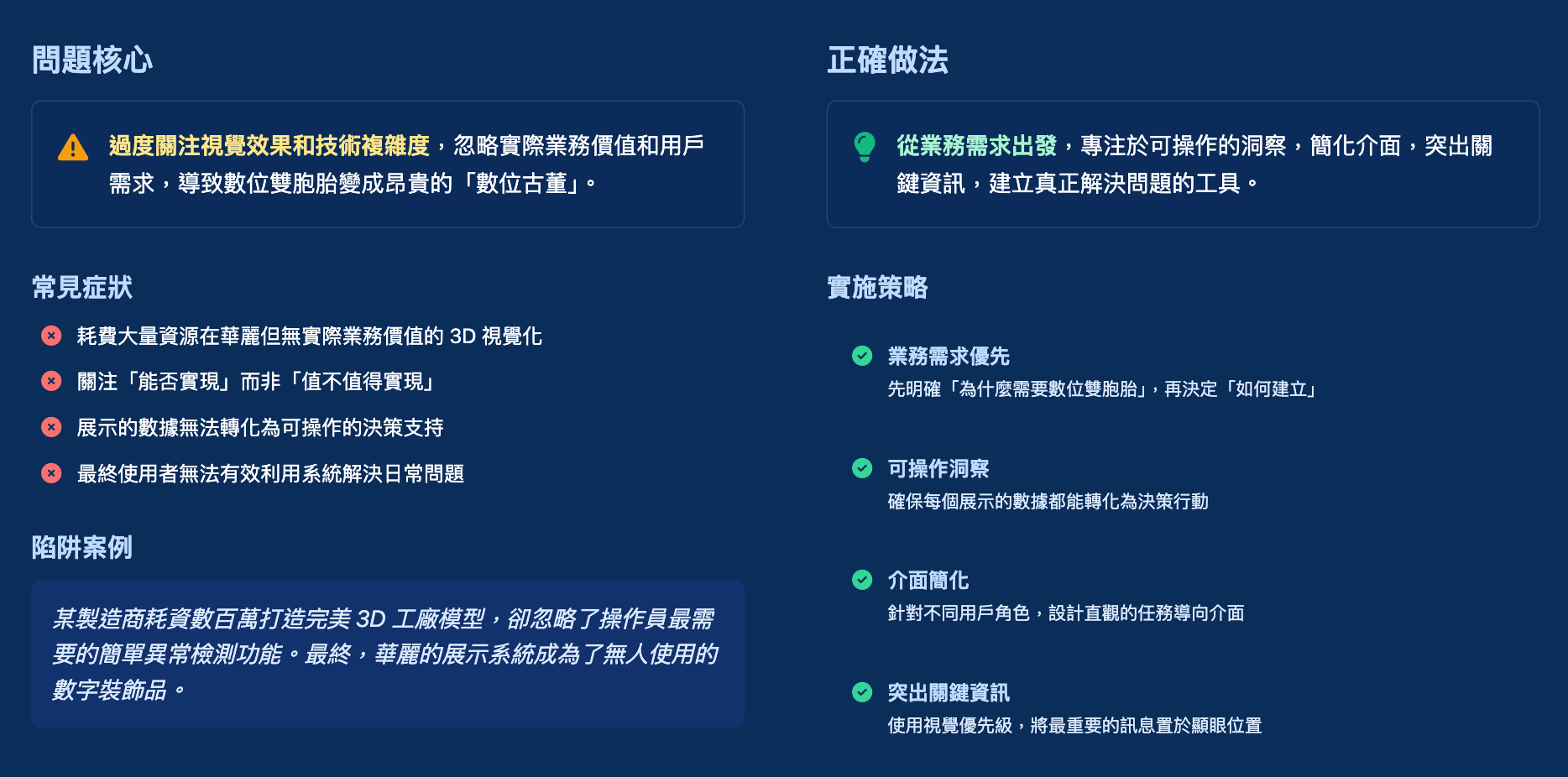 問題核心: 過度關注視覺效果和技術複雜度,忽略實際業務價值和用戶需求,導致數位雙胞胎變成昂貴的「數位古董」(digital artifact)。