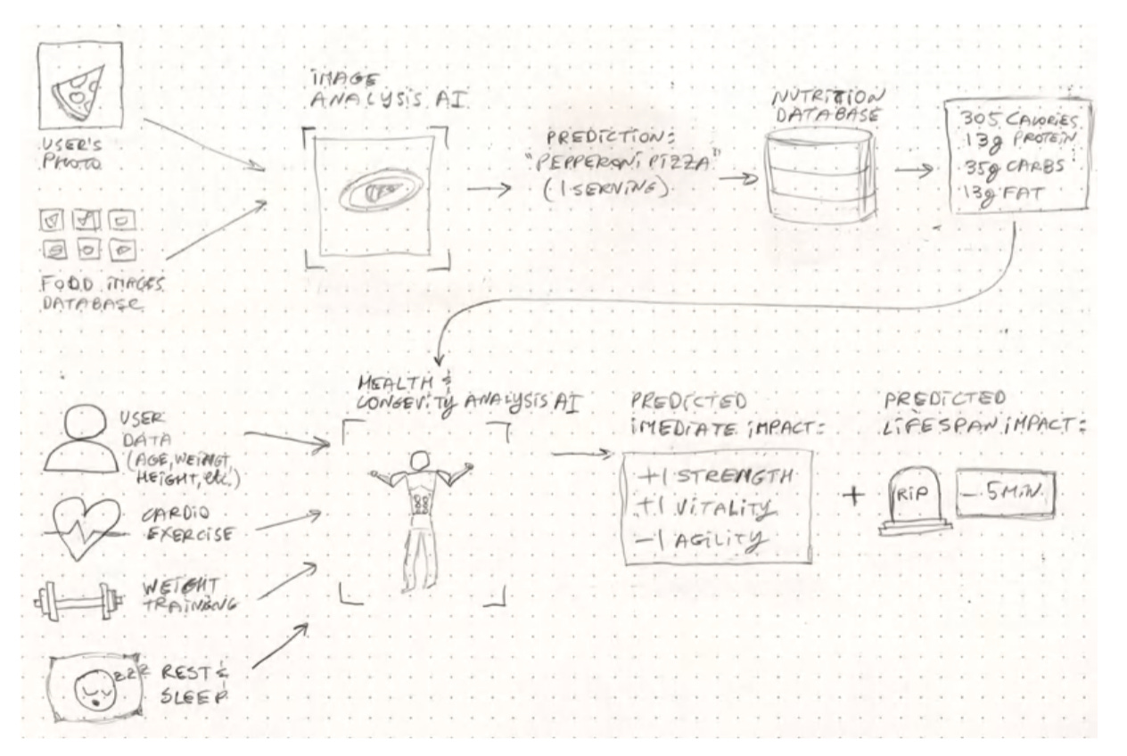 在第二列,這些營養數據會與用戶的個人數據(心肺功能、體重、運動和休息狀況)結合,並輸入到一個健康與壽命分析 AI 模型中。這個模型會回傳預測的即時影響,採用類似龍與地下城(D&D)的風格(例如:因蛋白質而「力量+1」,因高脂肪和高加工碳水化合物而「敏捷-1」),以及對此人壽命的總體預測影響(例如:由於這片臘腸披薩對於久坐的生活方式來說不是最健康的選擇,因此「壽命-5分鐘」)。