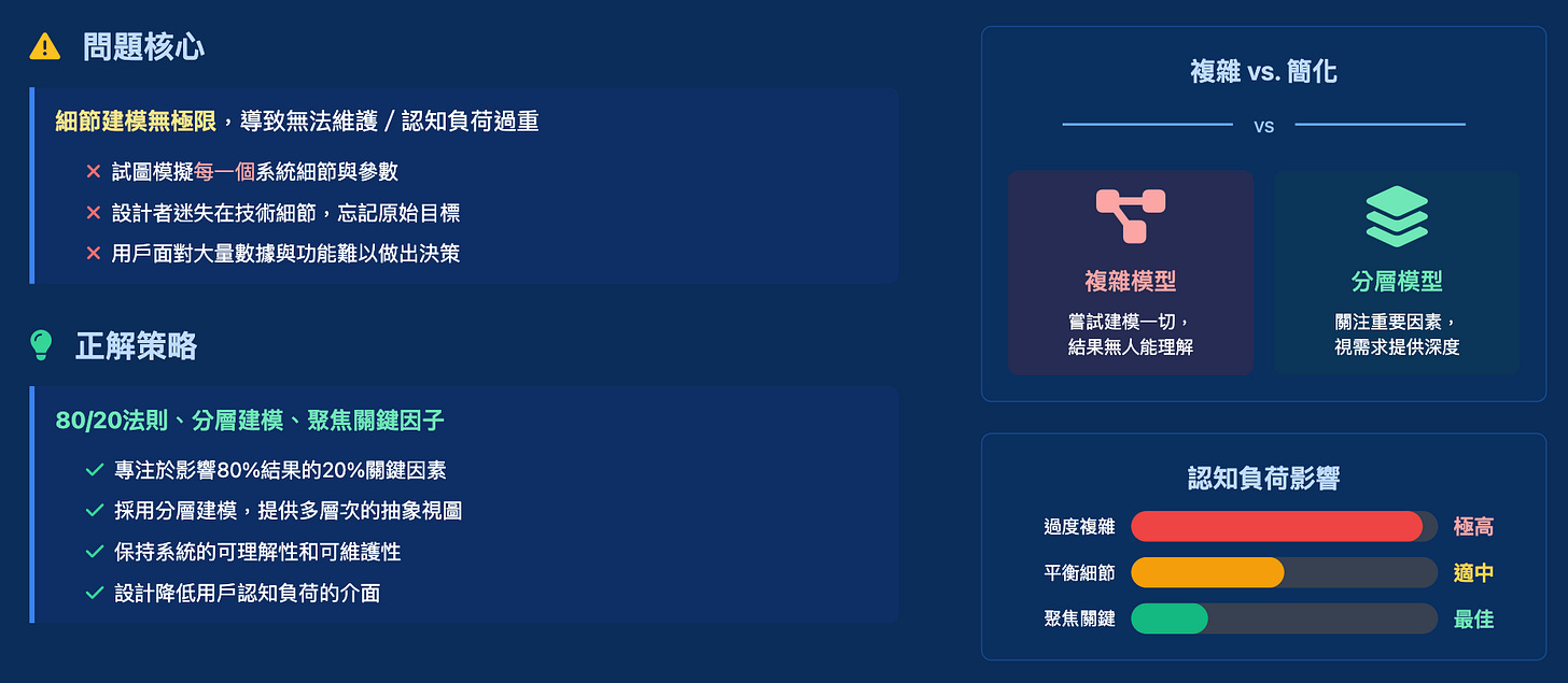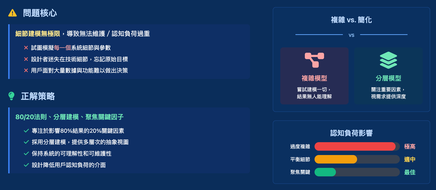 正確做法: 採用 80/20 原則,專注於影響 80% 結果的 20% 因素,採用分層建模 (hierarchical modeling),並保持系統的可理解性和可維護性。