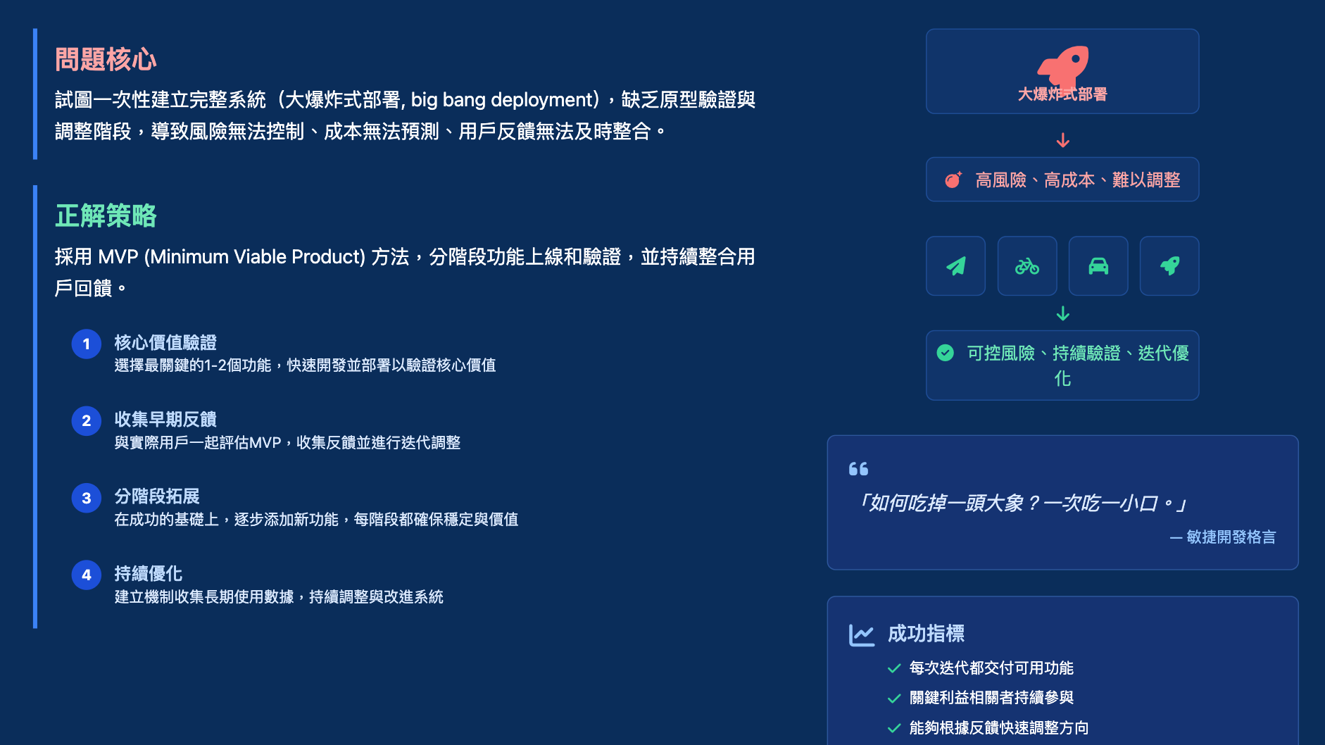 正確做法: 採用 MVP (Minimum Viable Product) 方法,分階段功能上線和驗證,並持續整合用戶回饋。