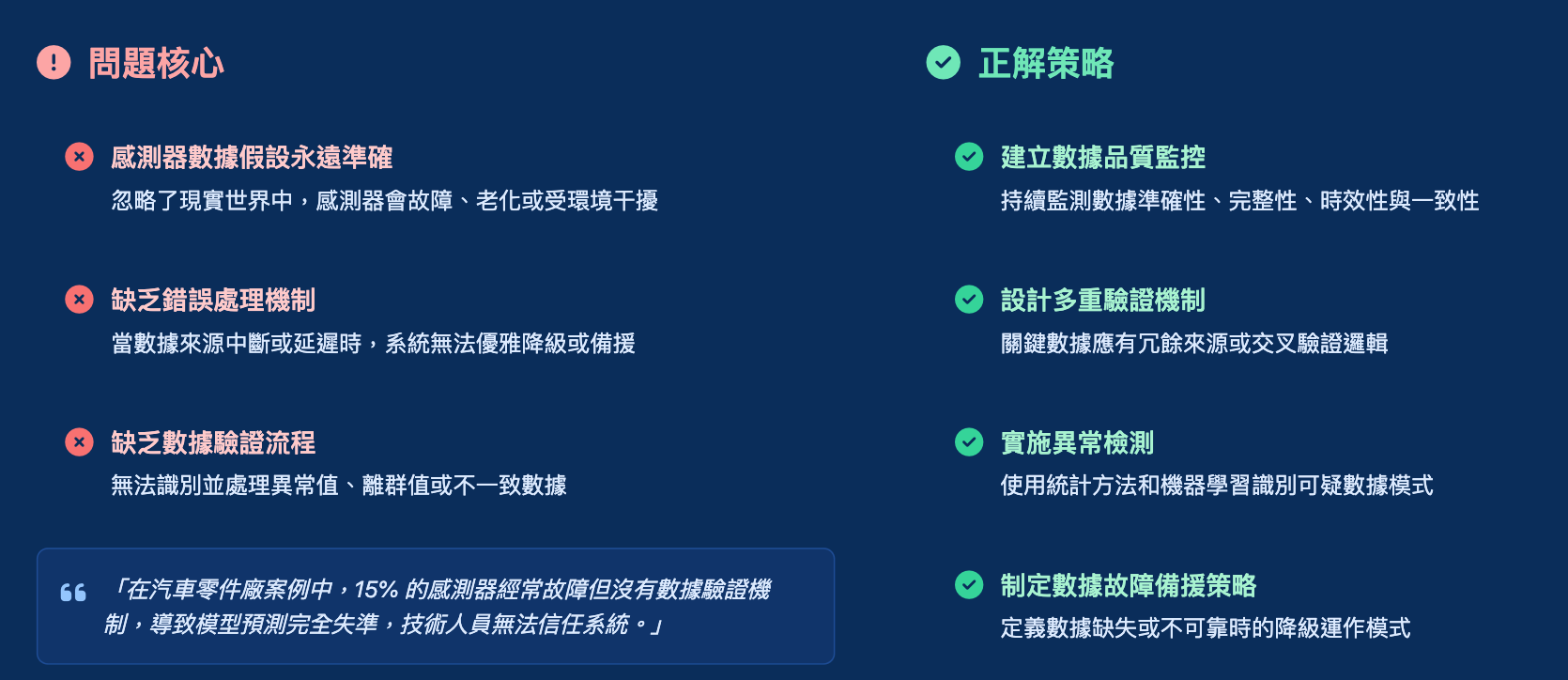 正確做法: 建立數據品質監控 (data quality monitoring),設計多重驗證機制 (redundancy checks),實施異常檢測 (anomaly detection),並制定數據故障時的備援策略。
