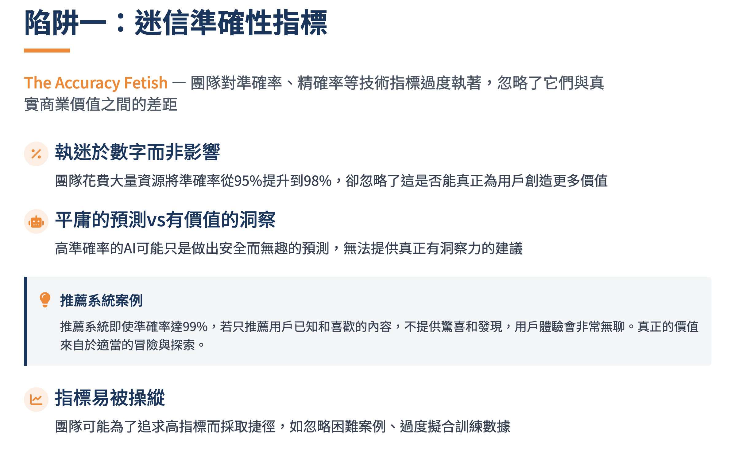 團隊將準確率、精確率等技術指標奉為圭臬,卻忘了它們與商業成功之間沒有必然的等號。一個推薦系統就算準確率 99%,若推薦的都是安全牌,用戶只會感到無聊透頂。價值來自於洞察與驚喜,而非可預測的平庸。