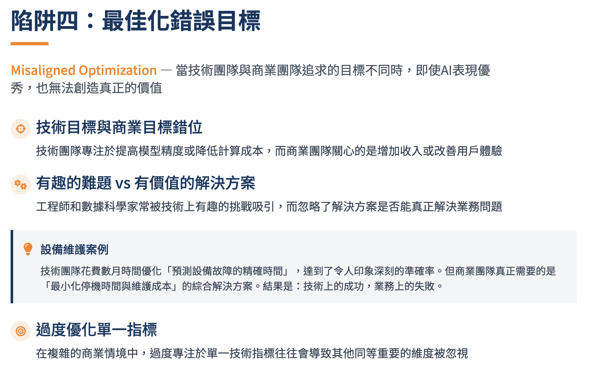 當技術團隊在最佳化「預測設備故障的精確時間」,而商業團隊關心的是「最小化停機時間與維護成本」時,目標就已經錯位了。AI 解決的不應是技術上有趣的難題,而應是商業上真正有價值的問題。