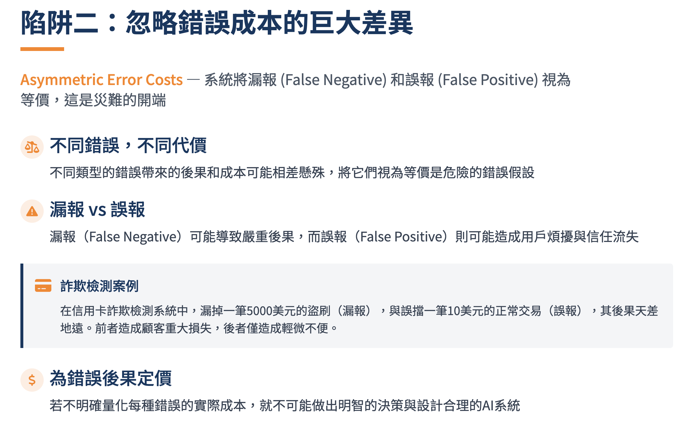 系統將漏報 (False Negative) 和誤報 (False Positive) 視為等價,這是災難的開端。在詐欺檢測中,漏掉一筆 5000 美元的盜刷,和誤擋一筆 10 美元的正常交易,其後果天差地遠。不為錯誤的後果定價,就不可能做出明智的決策。