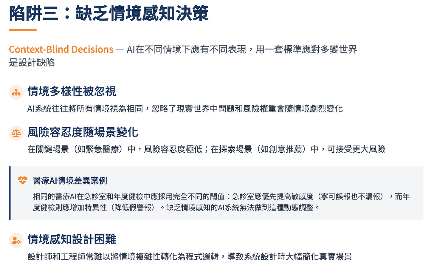 AI 在不同情境下應有不同表現,這是一個常被忽略的事實。醫療 AI 在急診室和年度健檢中,對風險的判斷標準絕不相同。用一套僵化的標準去應對多變的世界,本身就是一種設計缺陷。