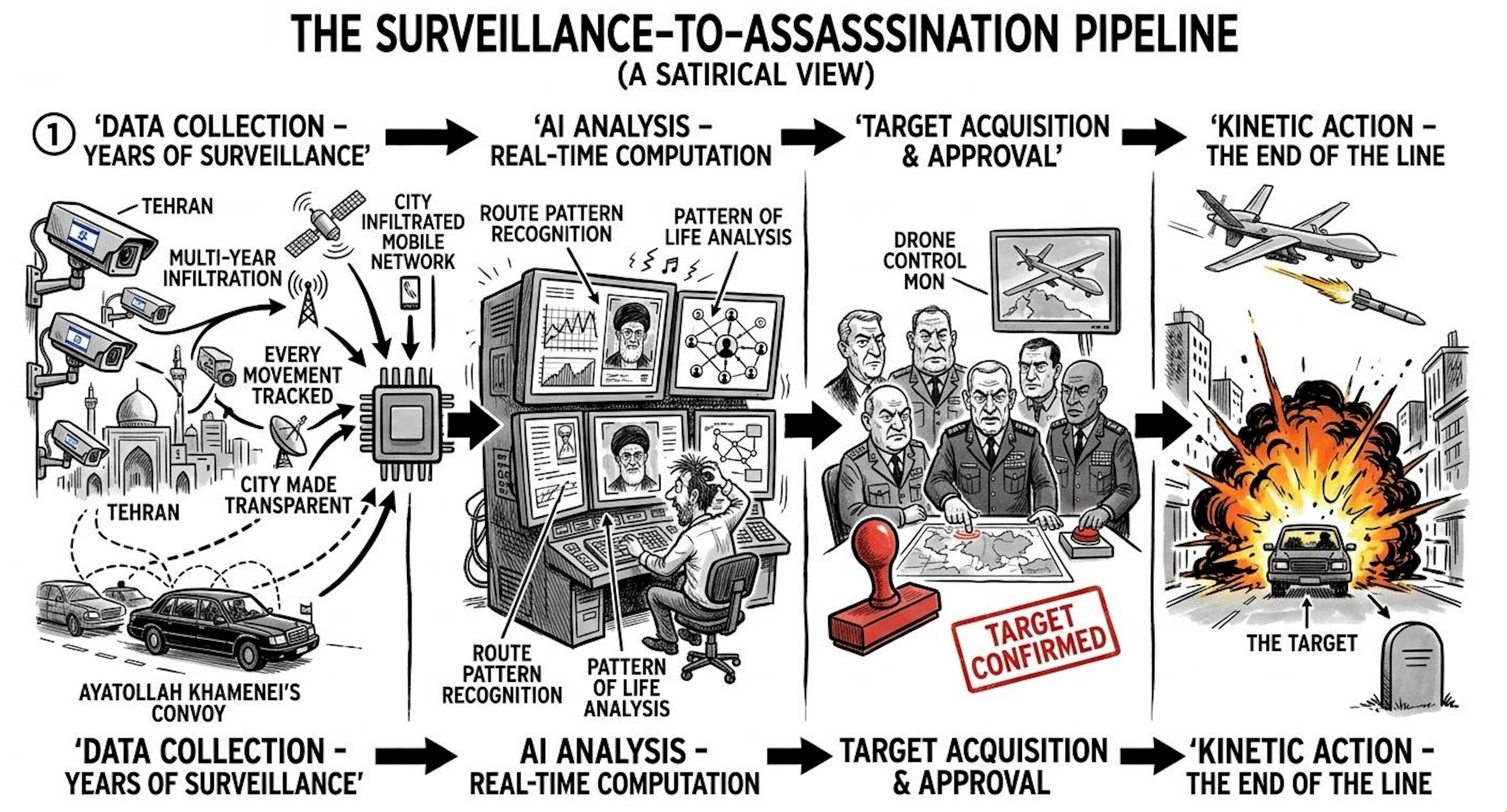 《金融時報》2026 年 2–3 月發布的長篇調查,以「Operation Midnight」為核心,重建美國與以色列為刺殺伊朗最高領袖哈米尼(Ayatollah Ali Khamenei)所策劃的多年情報與軍事行動。報導不只描述一場空襲,而是從「多年監控 → 即時演算 → 決策機制 → 執行與後果」完整呈現「城市監控+AI 情報 × 定點清除」的戰略鏈。