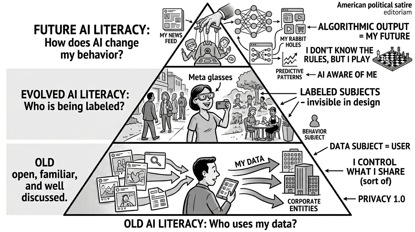 公眾 AI 素養若停留在「我該怎麼保護自己的資料」,就永遠看不見「別人的資料怎麼被用」。哈米尼報導強迫我們面對:當你戴著 Meta 眼鏡走過咖啡店,你周遭的每個人都在不知情的情況下,成為你眼鏡「視野」裡的節點。這不是隱私問題,是誰有權把誰變成節點的權力問題。