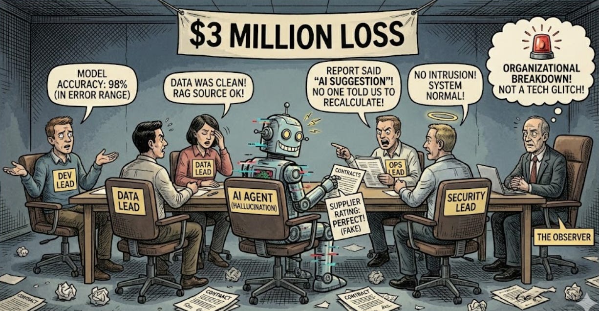 開發主管攤手:「模型準確率 98%,這在誤差範圍內。」 資料主管搖頭:「餵給模型的資料是乾淨的,RAG 檢索源也沒問題。」 業務主管抗議:「報告上寫著『AI 建議』,我們只是照做,沒人告訴我們要人工重算一遍。」 資安主管更是無辜:「沒有入侵警報,系統運作正常。」