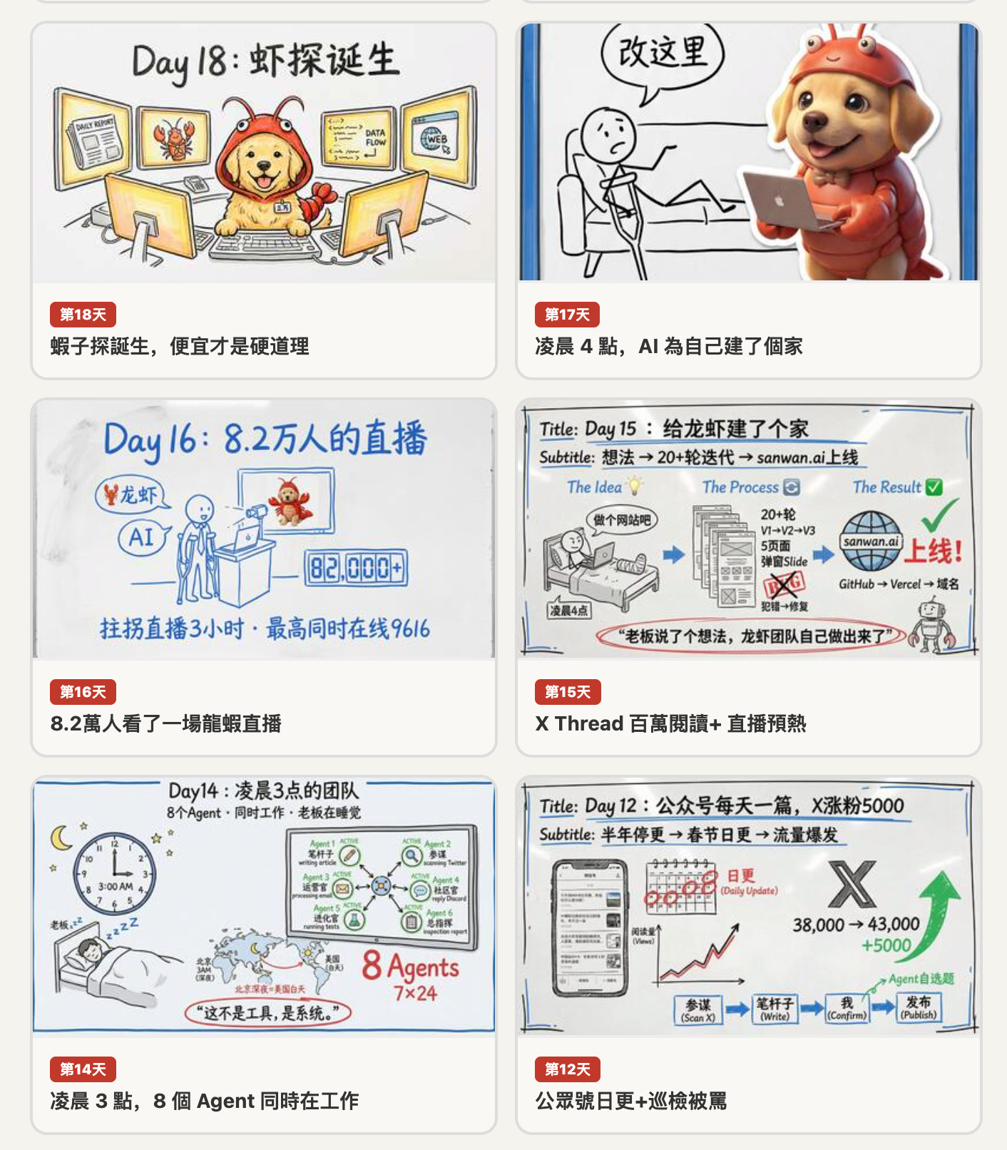 2026 年春節,傅盛躺在床上,一名髖關節脫臼的 CEO,只用語音和截圖,14 天內養出一支 7×24 小時運作的 AI 團隊,進化成 8 個 Agent。這支「龍蝦」團隊在 7×24 自動運轉下,做出了公眾號 10 萬+ 閱讀、Twitter 百萬+ 瀏覽、直播與短影片百萬+ 觀看的成績,傅盛把它記錄在「sanwan.ai」的「龍蝦日記」裡,並寫道:「我感覺到暴風雨要來了。」 hao.cnyes