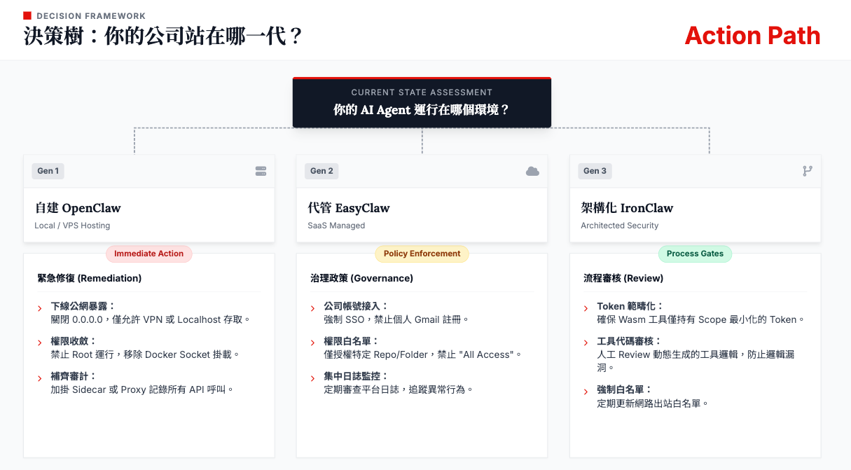 這對你來說,等於「從無控管」,過渡到「有中心可查、可追蹤」的階段,為未來更嚴格的架構(比如 IronClaw、企業級 SaaS 或內部自建)做準備。