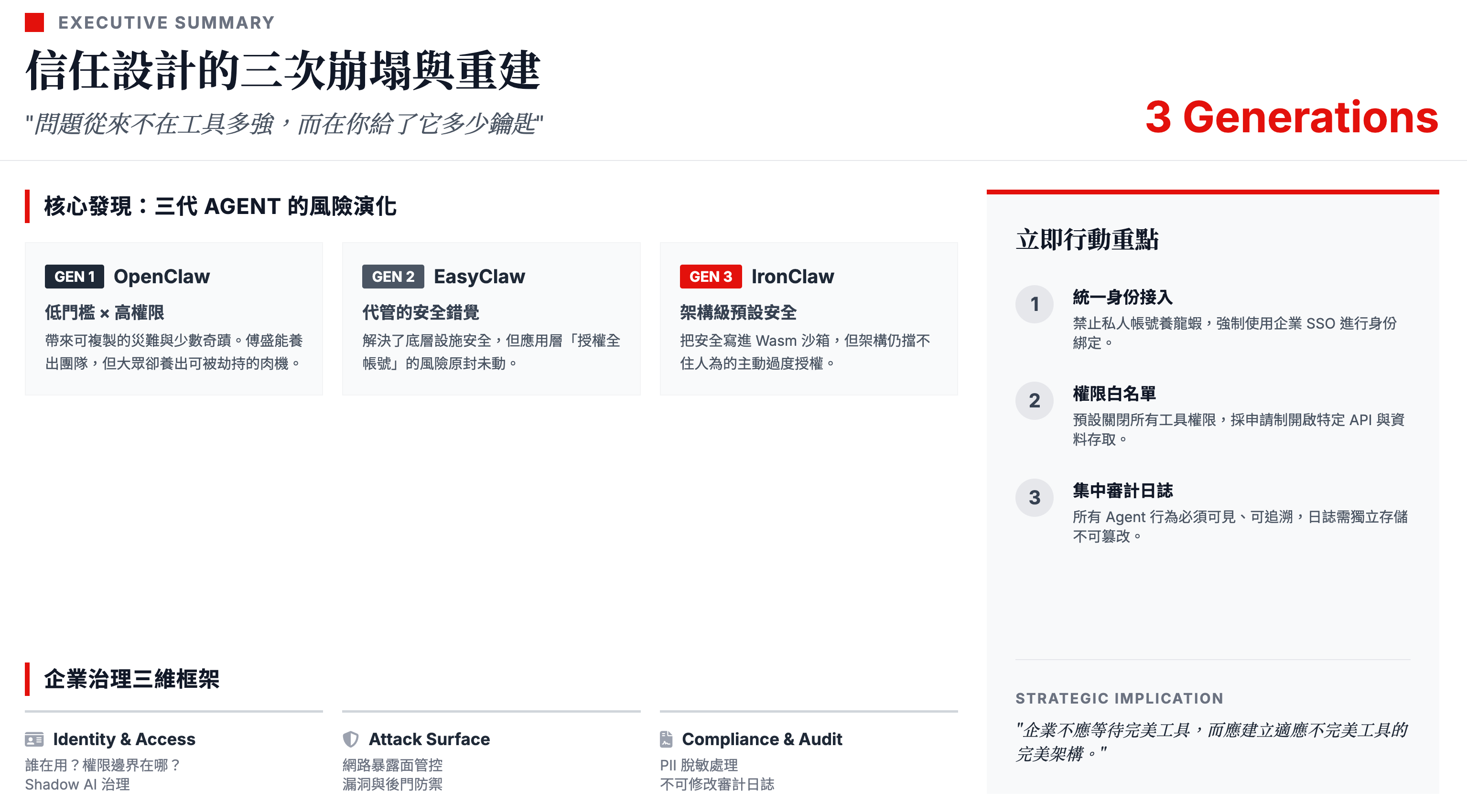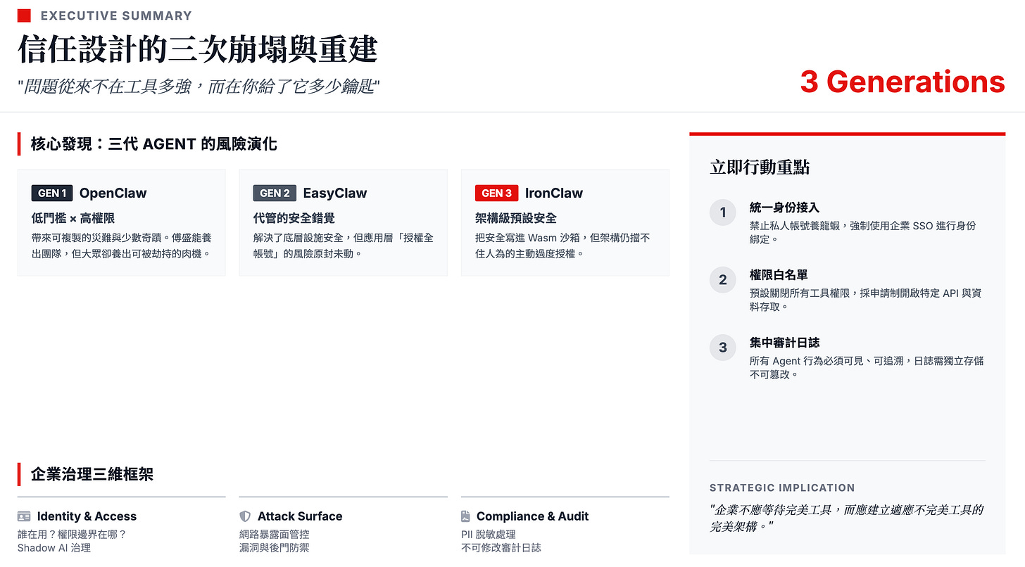 序言:龍蝦養得越大,咬你越痛。從 OpenClaw 的「低門檻高權限」、EasyClaw 的「SaaS 安全錯覺」、到 IronClaw 的「架構級預設安全」——三代 AI Agent 產品的演化,不是技術進步的故事,是信任設計反覆崩塌又重建的過程。你的公司現在站在哪一代?
