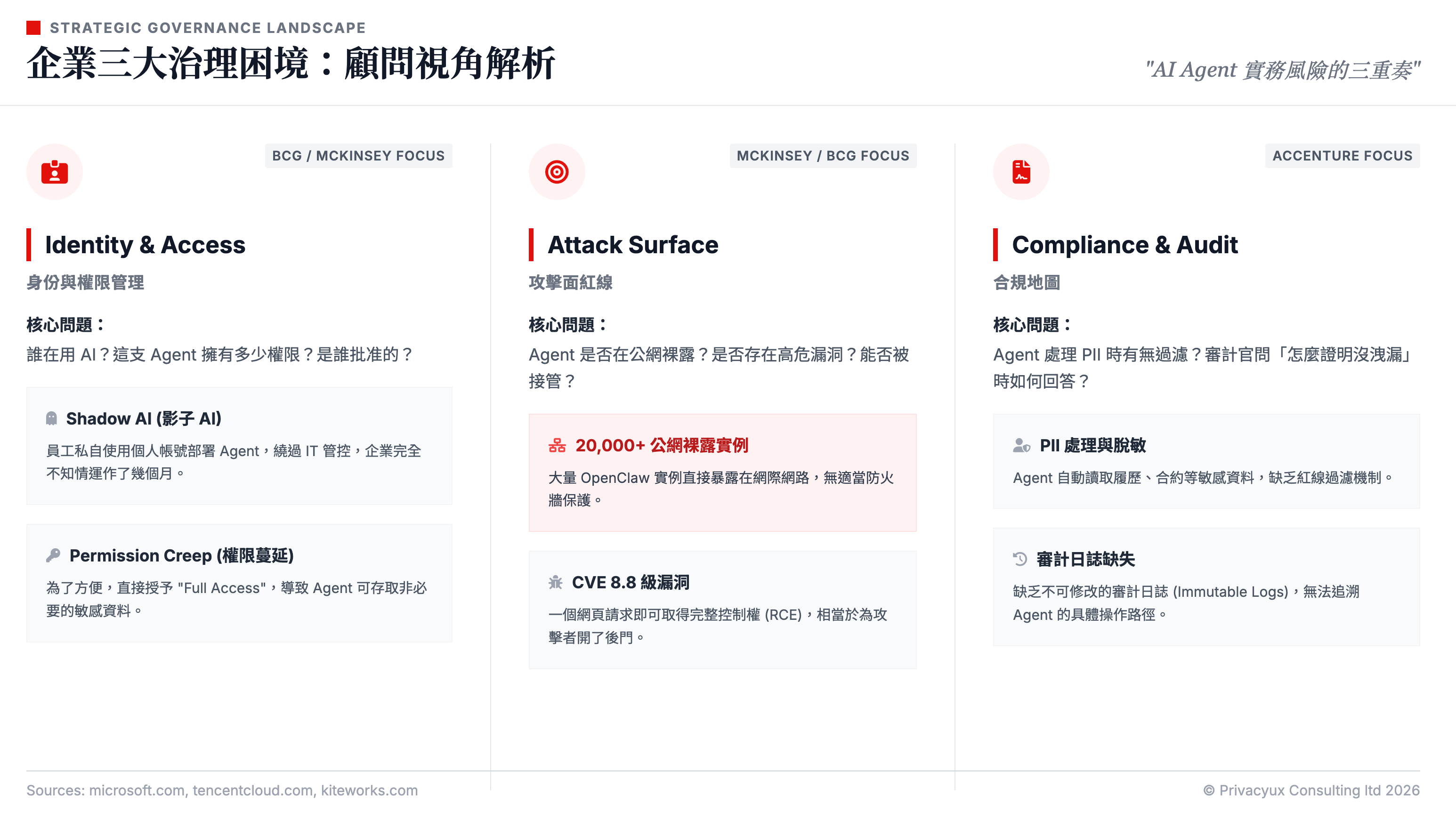 這問題我太熟了。過去幾個月,我在不同場景下反覆處理同一類問題—不是技術問題,是治理問題。OpenClaw 類 Agent 的實務風險,直接對應三個企業顧問圈談到爛的老問題:BCG 和 McKinsey 談的「身份與權限管理」(你的 AI 帳號有多少權限,誰批准的?Shadow AI 跑了幾個月你知道嗎?);McKinsey 和 BCG 畫的「攻擊面紅線」(20,000+ 個 OpenClaw instance 在公網裸露,CVE 8.8 級漏洞,一個網頁一鍵就能取得完整控制權);還有 Accenture 最常幫企業做的「合規地圖」(你的 AI 代理人自動處理 PII,但沒有紅線過濾、資料脫敏、不可修改的審計日誌—審計官問你「怎麼證明沒洩漏資料」,你怎麼回?)。