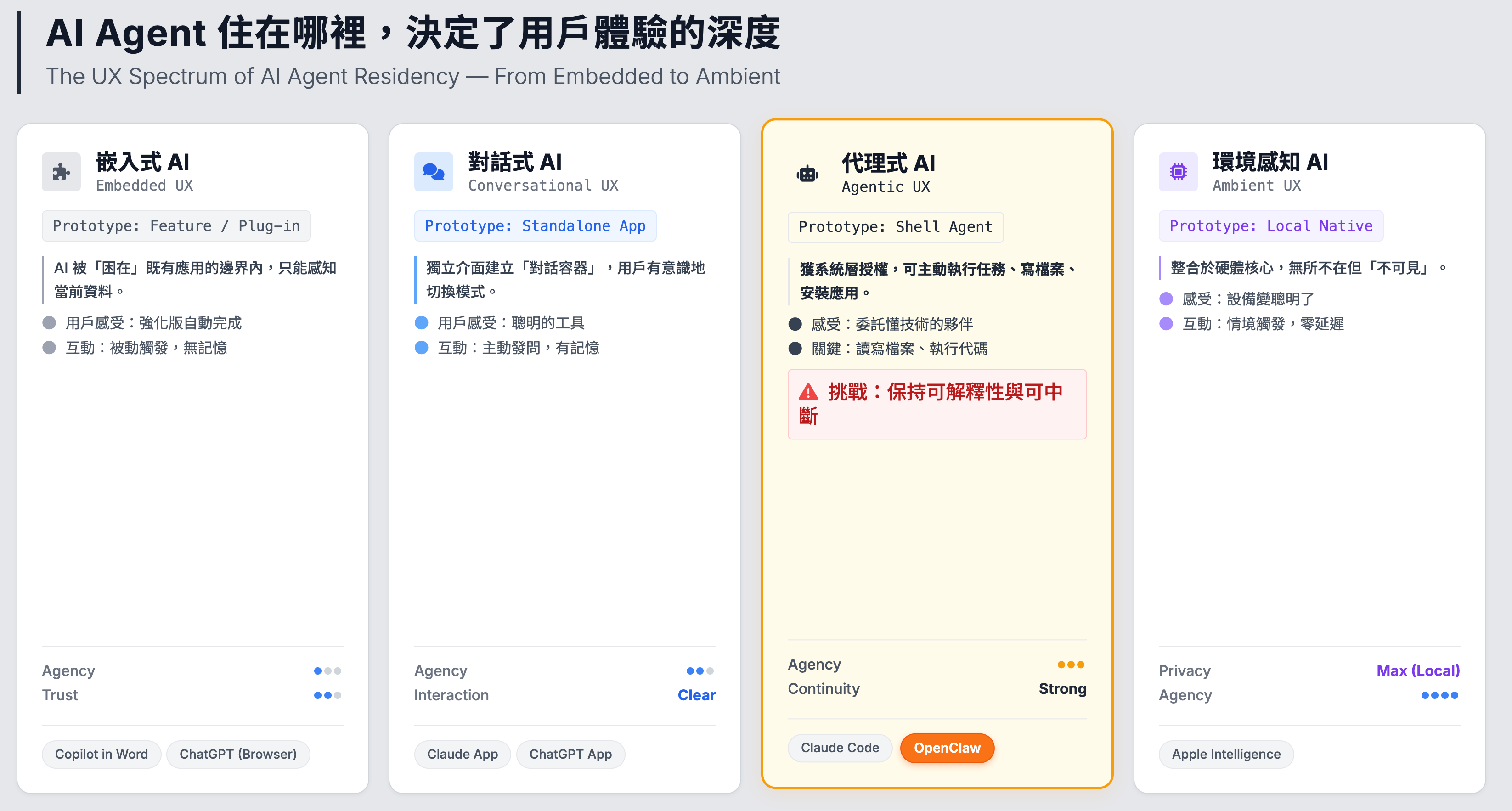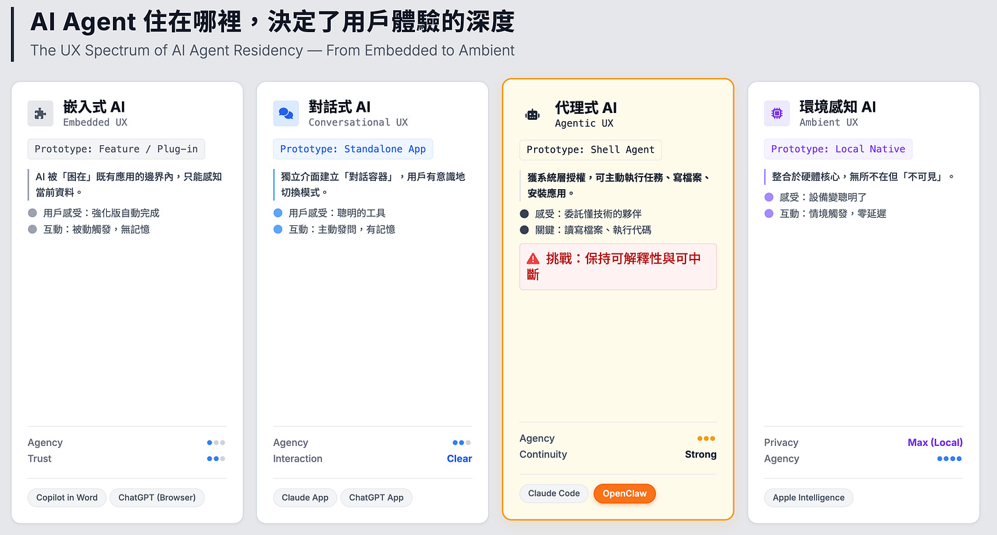 AI Agent 住在哪裡,決定了用戶體驗的深度。 下圖把 AI 代理的駐留形式分成四種:從「嵌入式」(如 Word 裡的 Copilot)到「對話式」(如 Claude App)、再到「代理式」(獲系統授權、可寫檔案與執行程式,如 Claude Code、OpenClaw),最後是「環境感知」(整合於硬體、無所不在如 Apple Intelligence)。