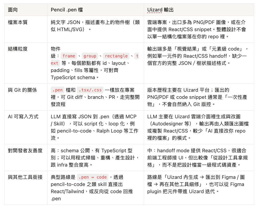 若要比得更細,Pencil 和 Uizard 的差異不只在「哪個生成比較漂亮」,而在設計成果在開發流程裡扮演什麼角色。下表對齊兩者在檔案本質、版控與 AI 寫入方式上的差別。
