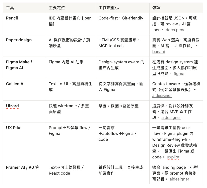 So What:solo 設計師、要快速出 demo → Paper;code‑first 團隊、要納入 CI → Pencil;已經在 Figma 生態 → Figma Make 優先。若用輸入方式來分:Prompt to UI(一句需求生多螢幕)有 UX Pilot;Screenshot to UI(草圖/截圖→原型)有 Uizard、Paper;Reference to UI(既有 code/repo 為本)有 Pencil、Ralph Loop—三類大概就齊了。