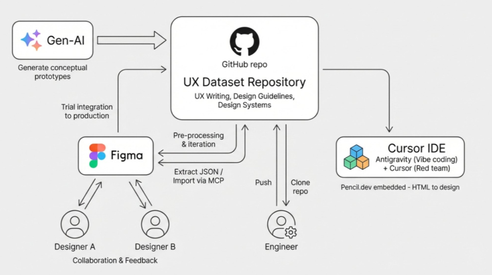 設計資產如何流轉? 下圖描繪的是以 UX Dataset Repository(GitHub repo) 為核心的 DesignOps 工作流:Gen-AI 生成概念原型並可試整合到 Figma;設計師在 Figma 協作,設計透過「Extract JSON / Import via MCP」進入 repo,與 UX 文案、設計規範、設計系統一起被版控;工程師從 repo clone,在整合了 Pencil.dev 的 Cursor IDE 裡直接「HTML to design」、把程式碼轉回可視設計。