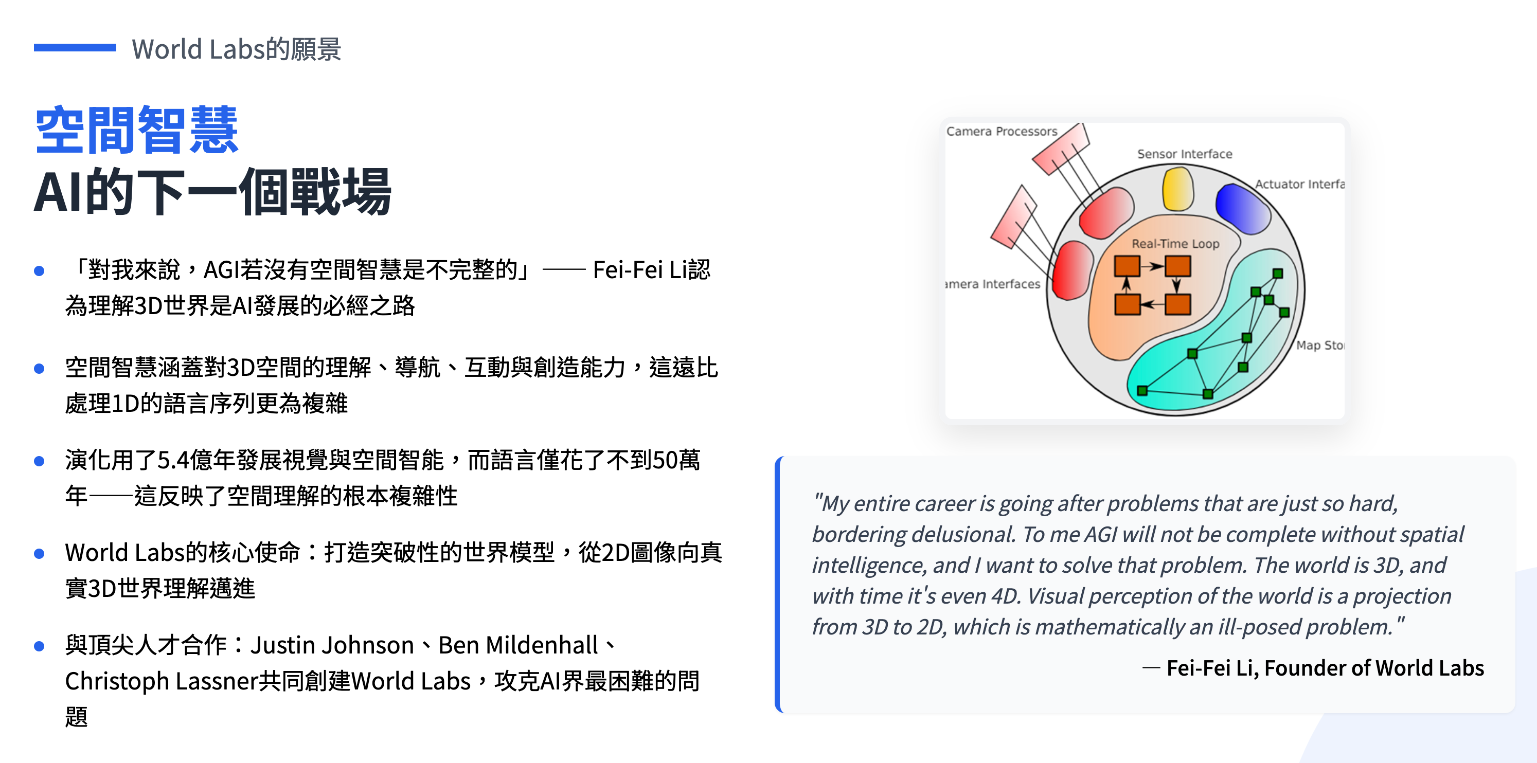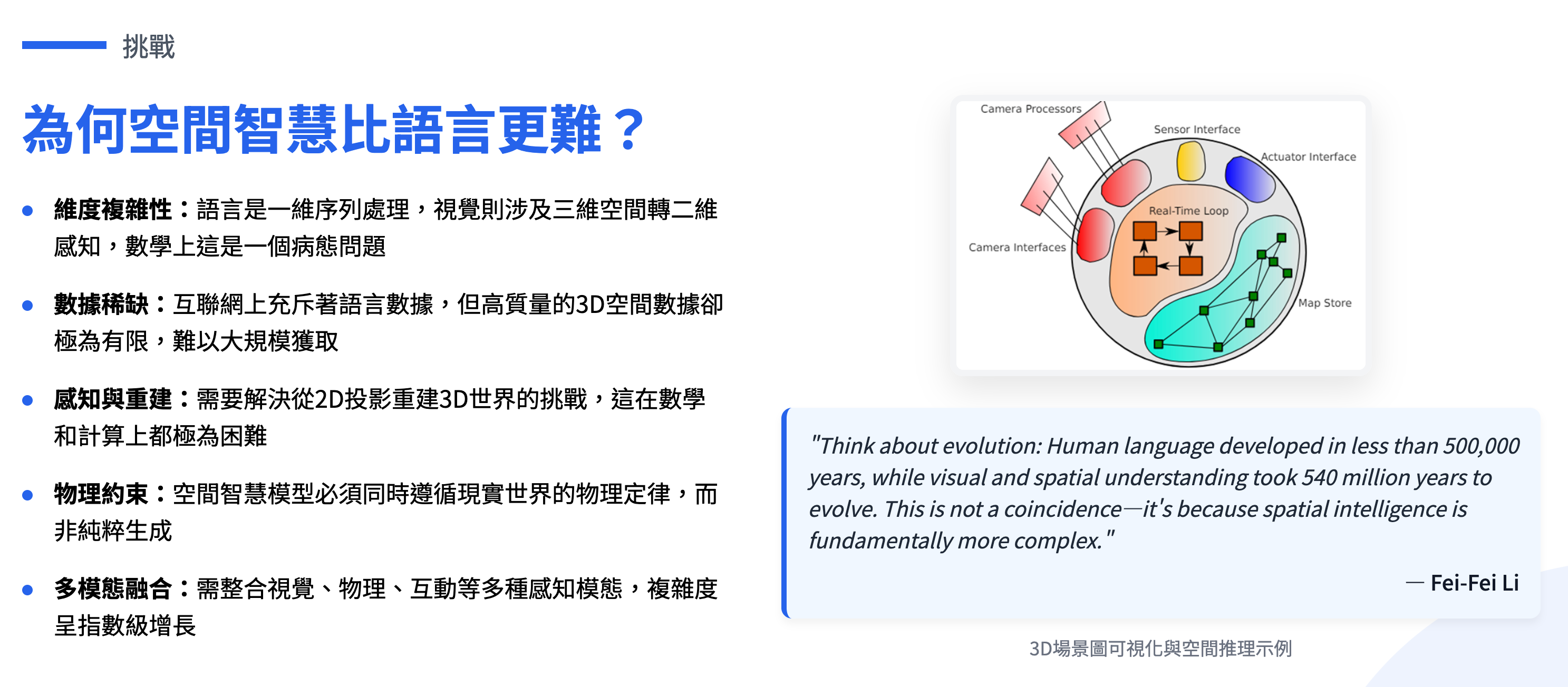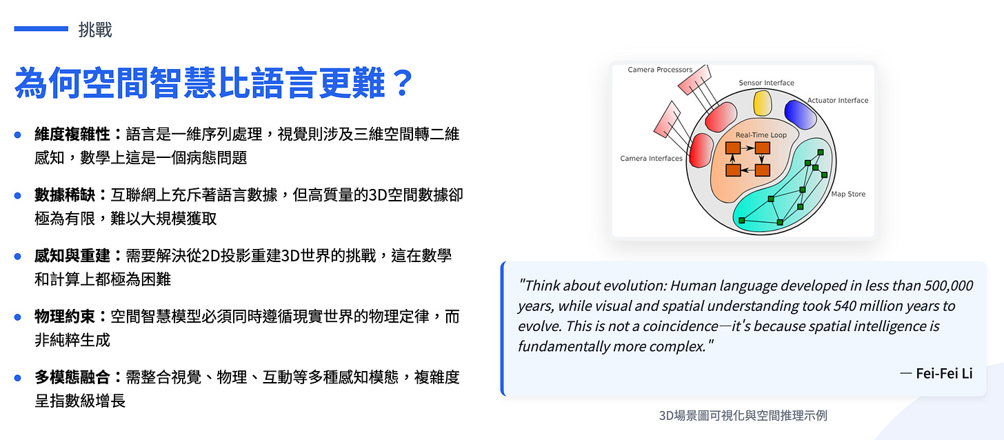 導師繼續說:「你問錯了問題。真正的問題,不是如何用新工具寫得『更快更好』,而是你能否去解決那些工具根本無法理解的『問題』。李飛飛給了我們一個極好的比喻:AI 在『語言』這個百萬年的賽道上狂奔,卻對『空間智慧』這個 5.4 億年的賽道知之甚少。你,想在哪個賽道上競爭?」