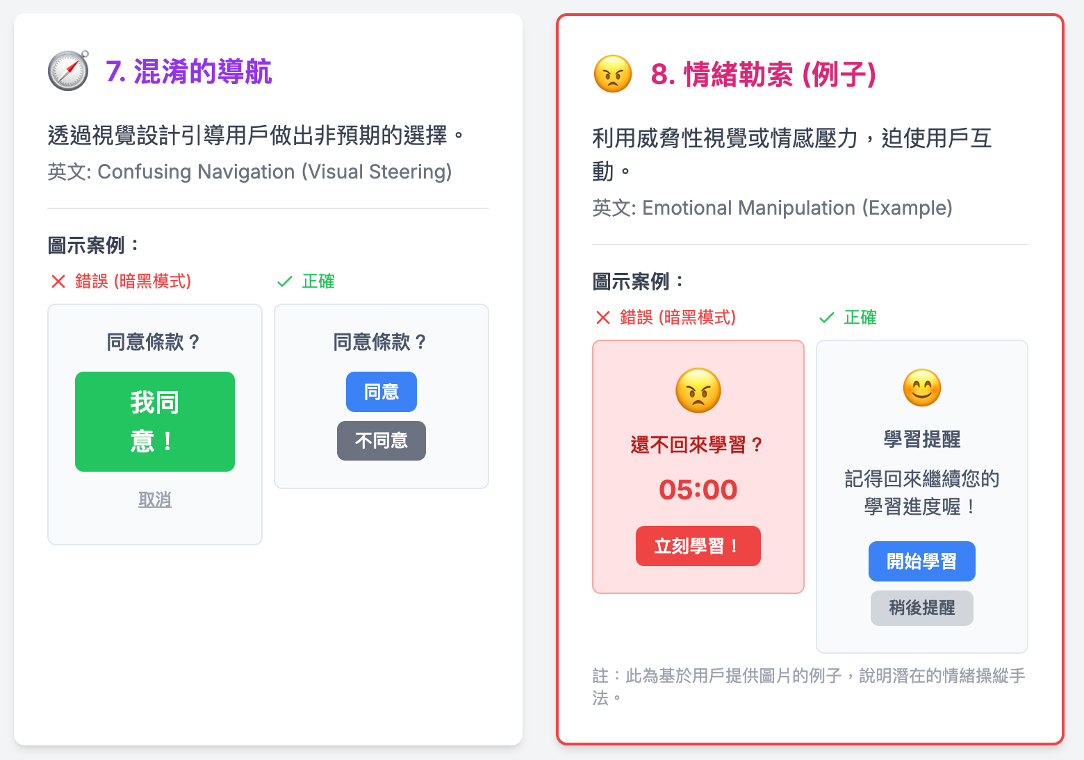 情緒勒索 (例子):利用威脅性視覺或情感壓力,迫使用戶互動。