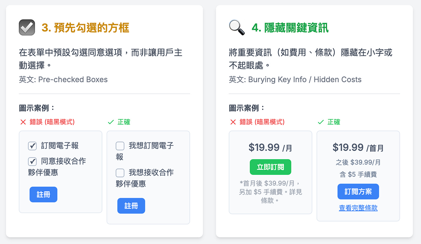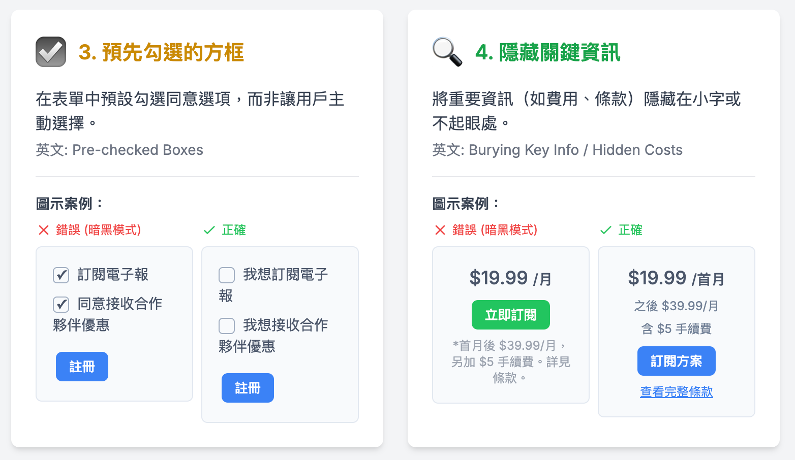 禁止隱藏資訊:費用、訂閱條款、數據使用政策等必須在用戶決策前清晰展示,不得隱藏。