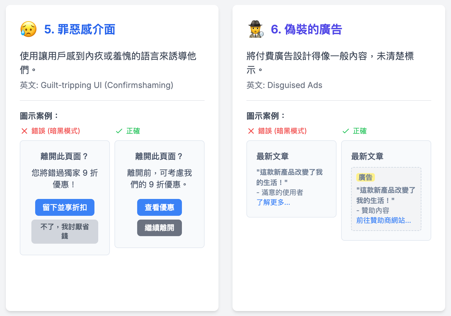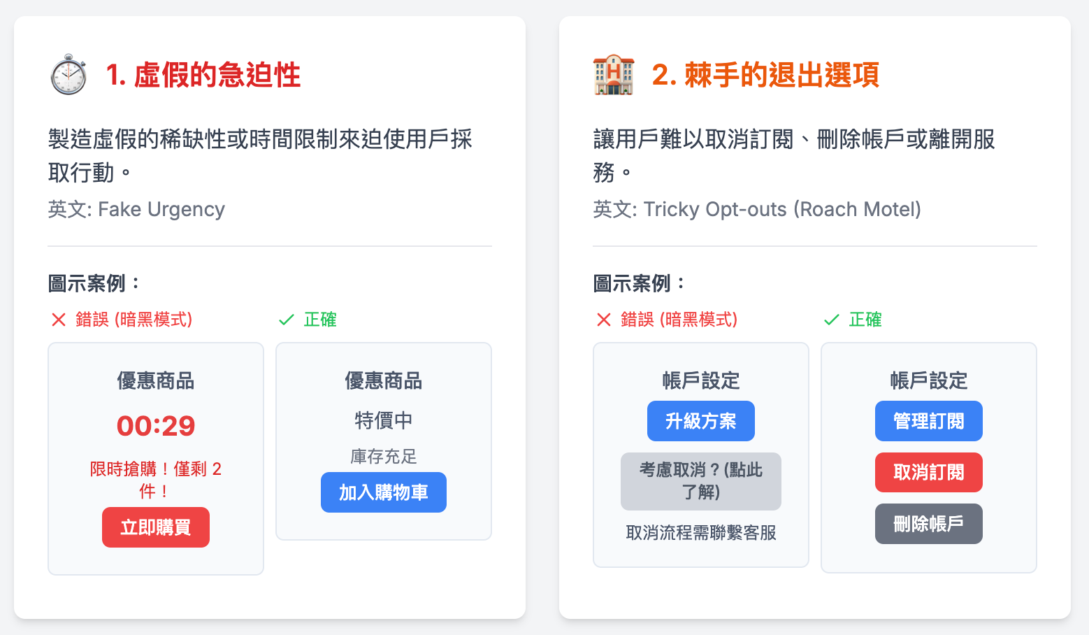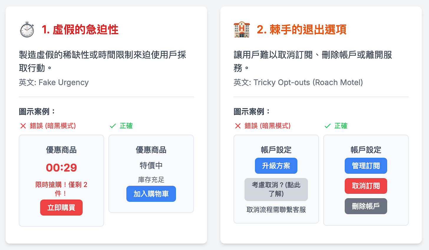 應用示例:用於高風險流程(如支付、訂閱)的設計審核或制定全公司範圍的道德設計指南。