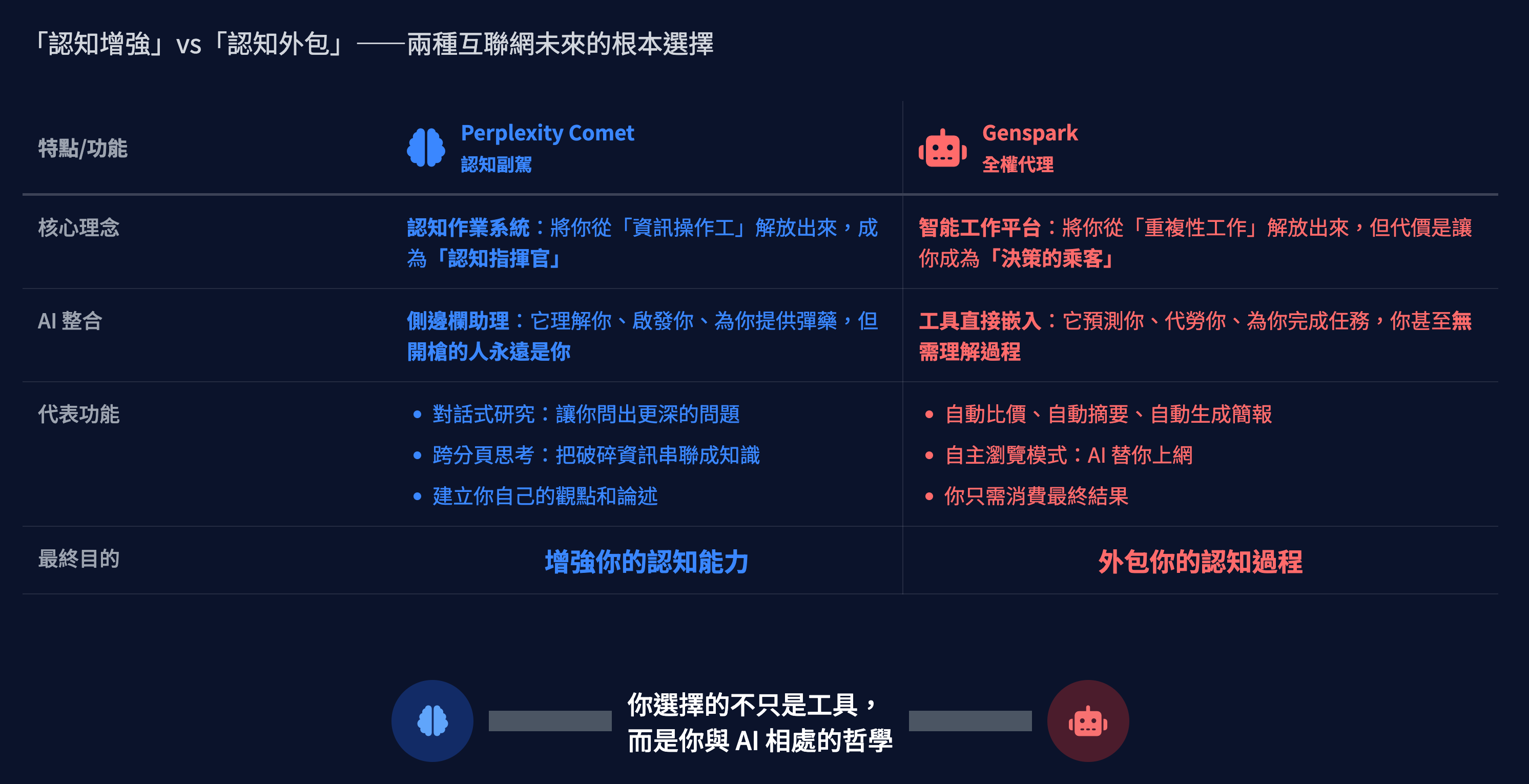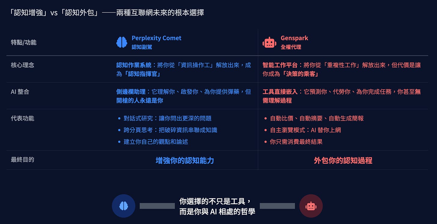 Perplexity Comet 和 Genspark,正是這個光譜的兩個極端。它們的每一個功能設計,都在印證各自的哲學。用這個視角重看,一切都變得尖銳起來: