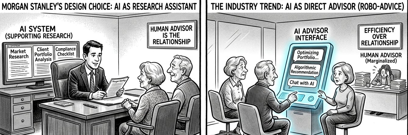 Morgan Stanley 的作法更明確:他們的 AI @ Morgan Stanley Assistant 從一開始就定位為「理專的研究助手」,不是「客戶的對話窗口」。系統可以幫理專快速調出市場研究、客戶持倉分析、合規檢查清單,但所有面客溝通仍由理專發出,AI 不直接接管受託關係。這個設計選擇的背後邏輯是:在高信任場景,AI 的角色是降低理專的認知負荷,不是取代理專的判斷責任(UX Magazine, 2024)。