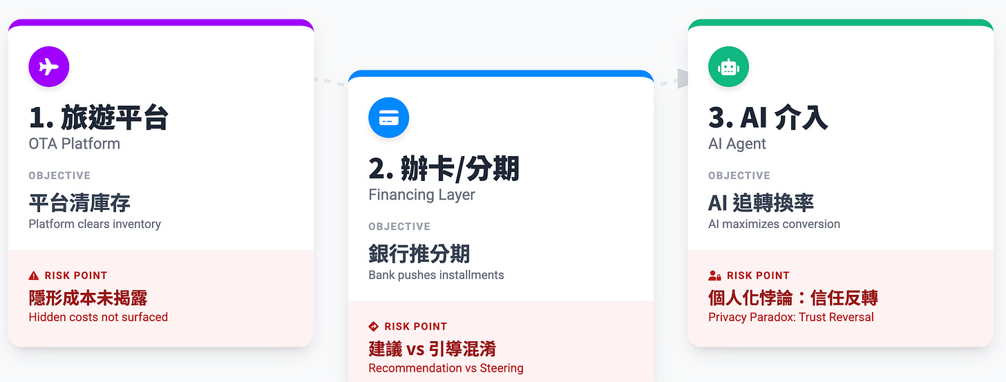 或者你在旅遊平台讓 AI 幫你排完一趟行程,表面上它幫你省時間,實際上你分不清它是在幫你省錢,還是在幫平台清庫存、幫銀行推高利分期?