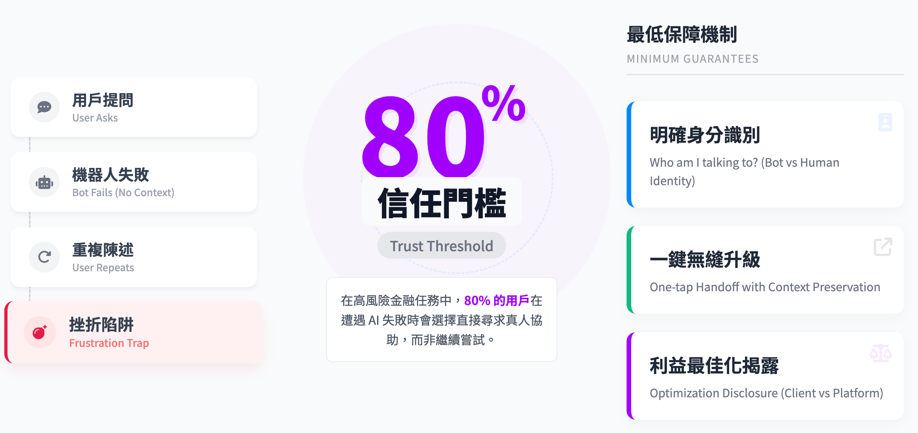 使用者真正要的不是「像人」,而是三個最低保障: