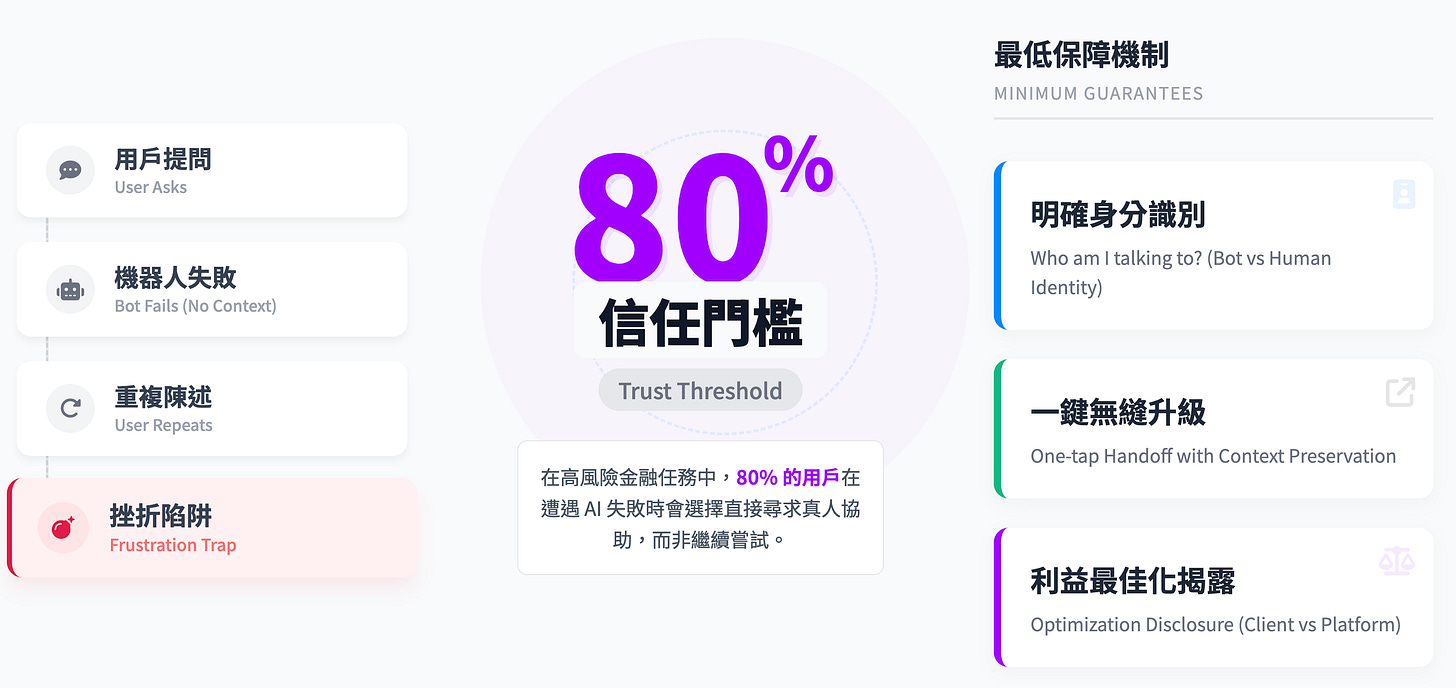 這不只是體感。Commonwealth Wealth Building Initiative 與 boost.ai(2024)的實地研究顯示,消費者對 chatbot 處理例行任務的信任相對高,但一旦進入個人化建議、貸款申請或金融教育,接近 80% 受訪者仍偏好真人;研究把這個落差稱為「trust threshold」。換句話說,介面流暢不等於信任可延伸。