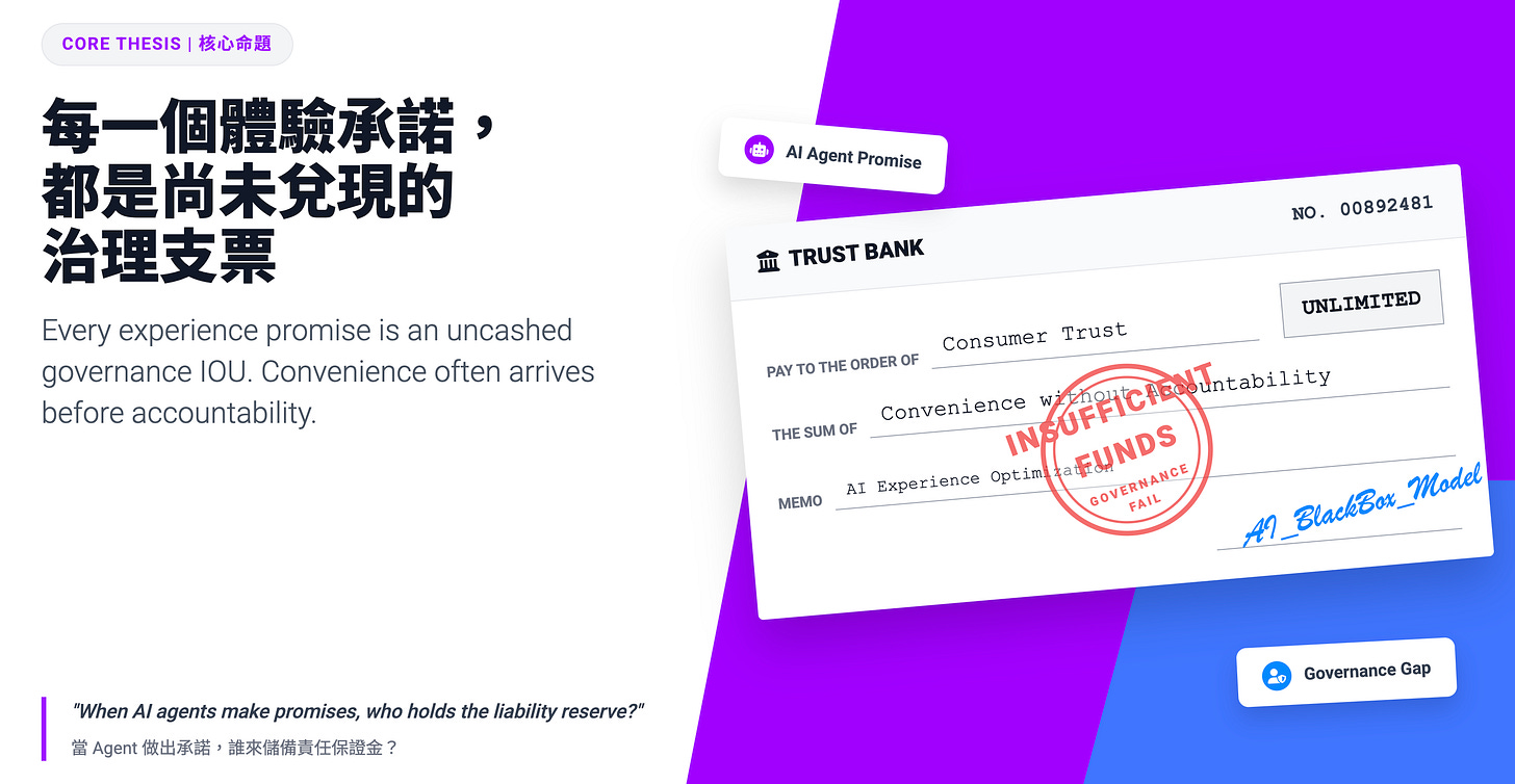 這篇的主命題很簡單:AI agent 的每一個體驗承諾,都是一張尚未兌現的治理支票。越往外看越好用,越往內看越欠帳。 在消費金融這一層,你看到的是支票開出來的表面:便利先到,責任常常還沒到。