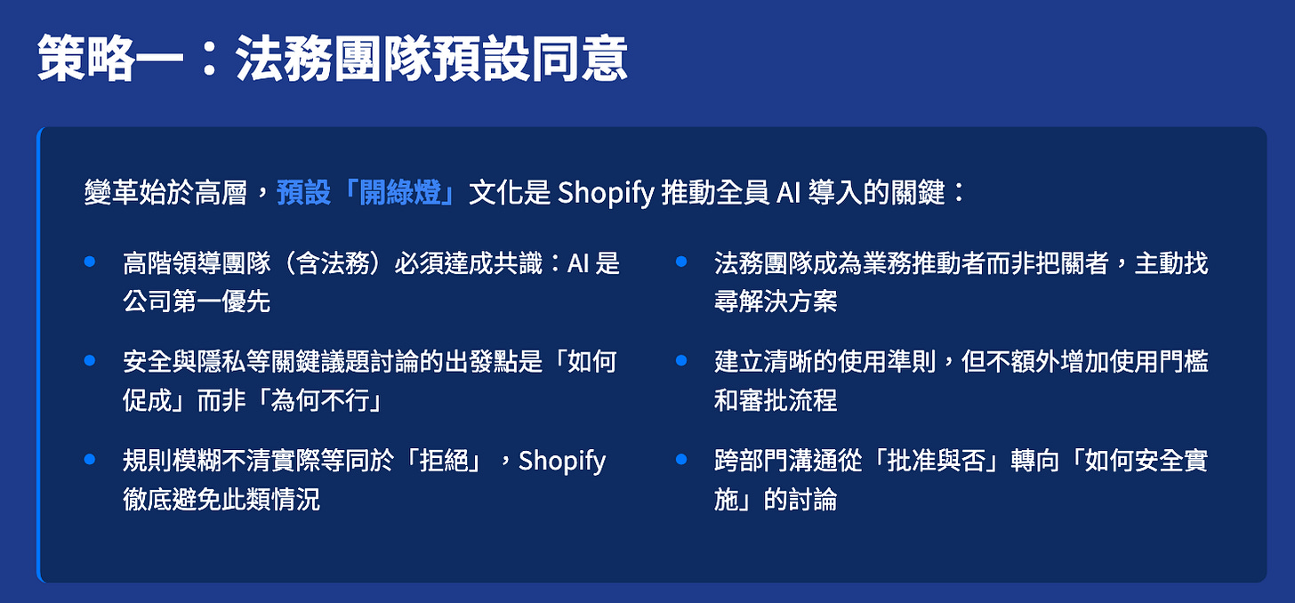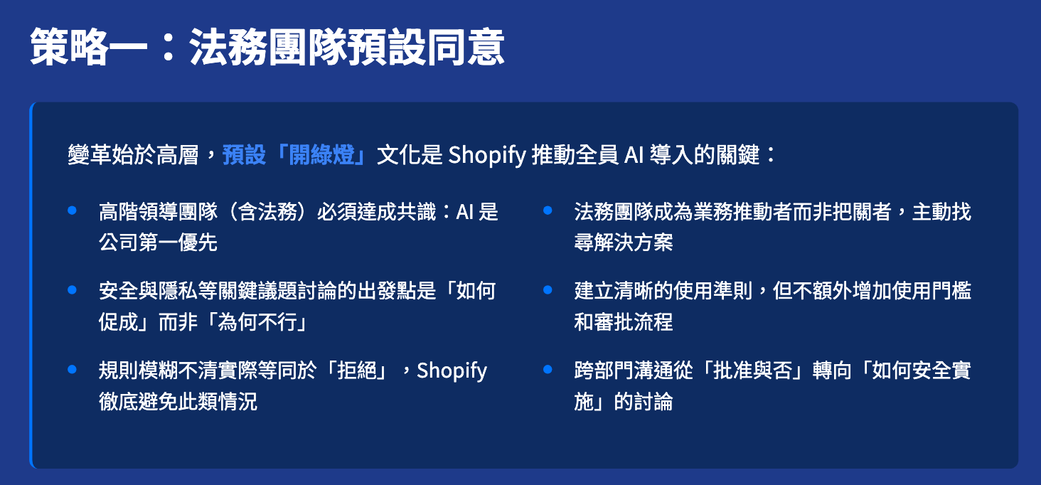 法務預設開綠燈:高層共識是「擁抱 AI 是最重要的事」。法務的角色不是說「不」,而是問「如何才能安全地做?」