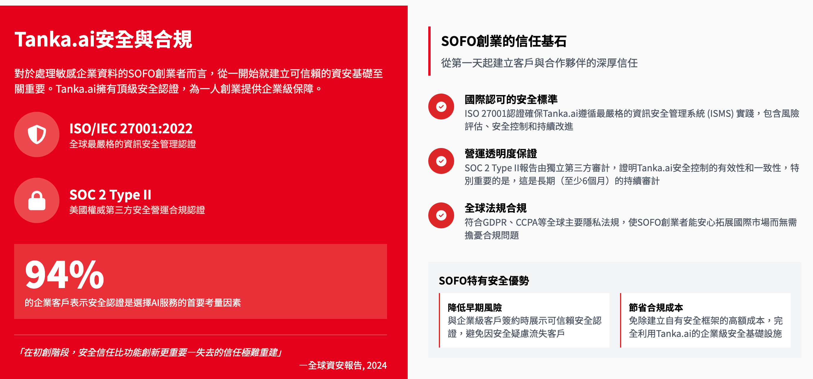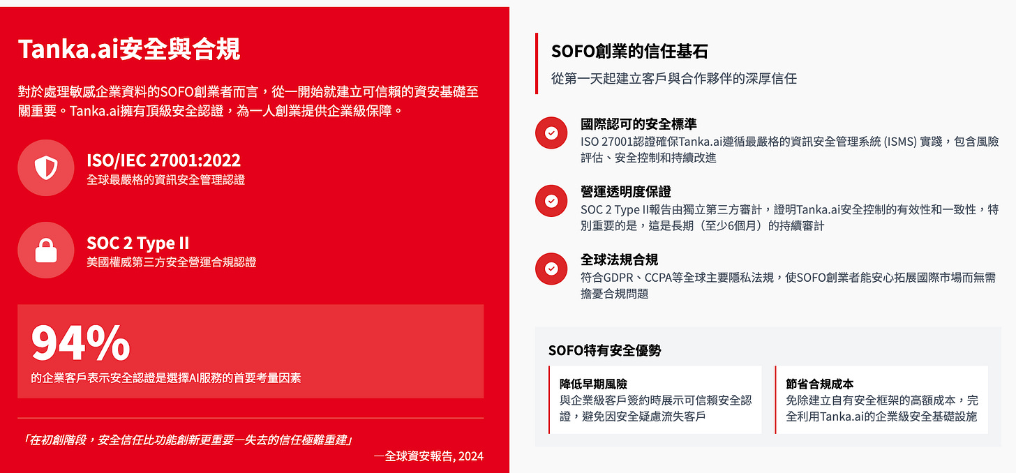 Tanka.ai擁有重要的安全憑證,已獲得 ISO/IEC 27001:2022 認證和SOC 2 Type II 合規。這些認證證明了其對資訊安全管理和營運透明度的嚴格承諾,這對於任何企業,尤其是處理敏感組織數據的企業而言,至關重要。對於一人創辦人而言,從第一天起就建立並展示強大的安全和合規性對於與早期客戶、合作夥伴和利益相關者建立信任至關重要,尤其是在監管要求高的行業中。這主動緩解了重大的技術和營運挑戰。