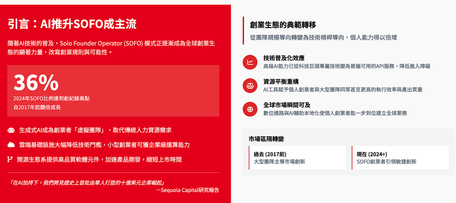 紅衫資本(Sequoia Capital)指出:「一人創業家(SOFO)正成為新創生態系統的關鍵力量,AI與自動化工具讓個人能以極低成本打造全球級產品,這是過去團隊型創業難以想像的規模槓桿。」— Sequoia Capital