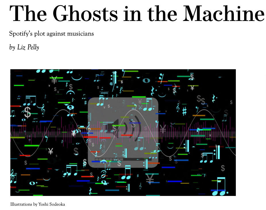 Pelly 發現,Spotify 透過與特定製作公司合作,委託他們用極低的成本生產大量風格單一的「功能性音樂」,並以虛構的「幽靈藝術家」名義發布。這些音樂被大量植入 Lo-Fi、爵士、古典等適合被動聆聽的官方播放列表,直接取代了真正獨立音樂家的位置。